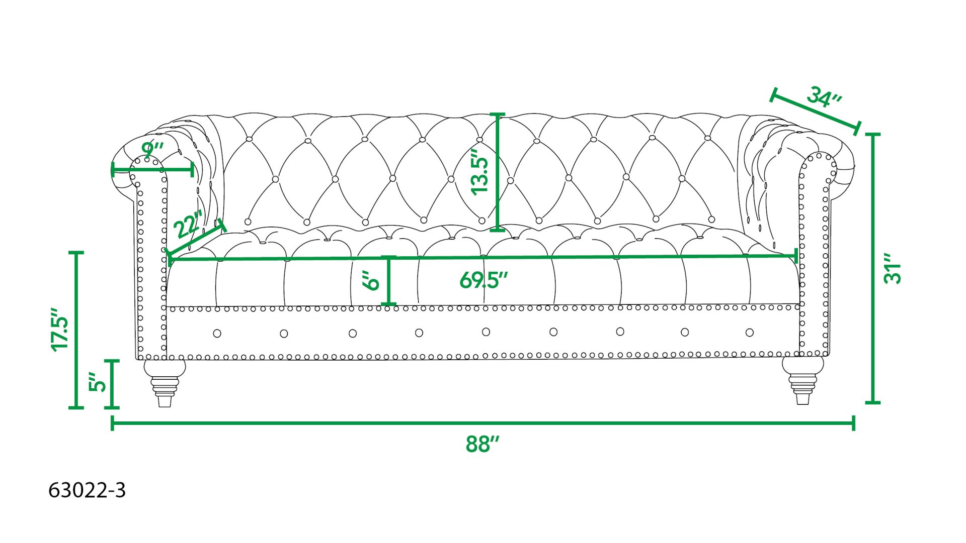 • Elegant Accents: The sofa boasts hand-applied iron nailhead accents with an antique brass finish, along with button tufting along the arms, seat, and seat back for a classic touch.
