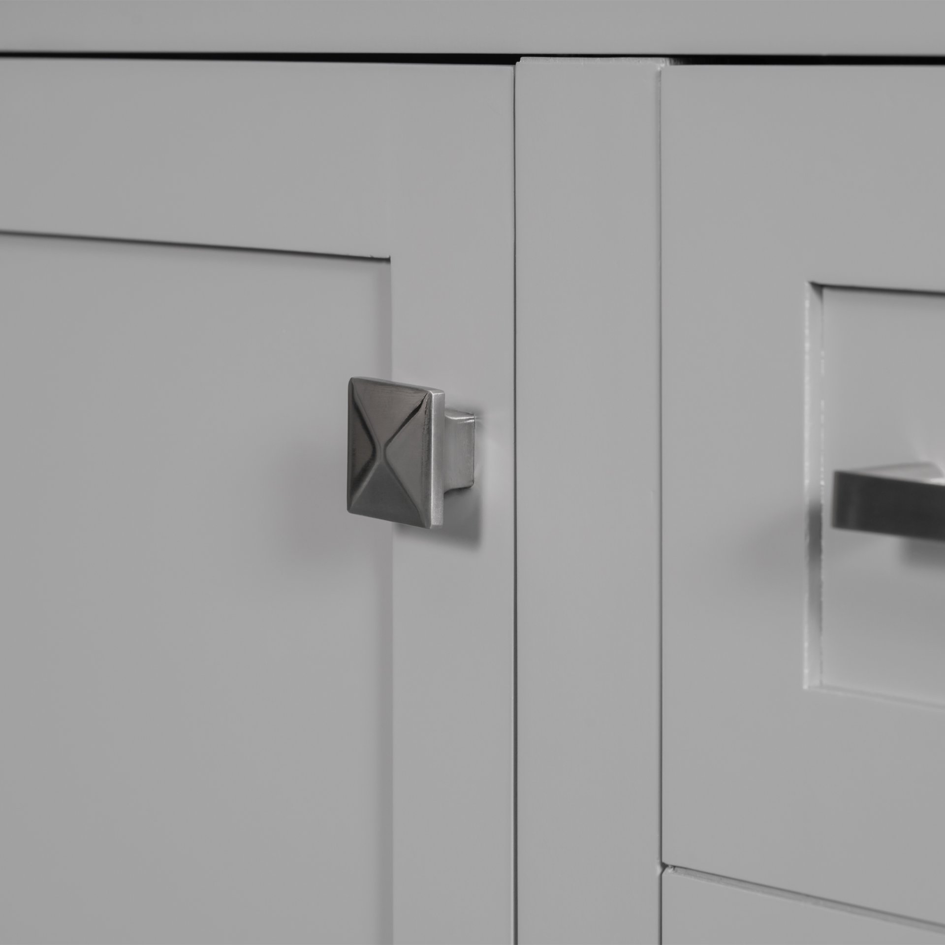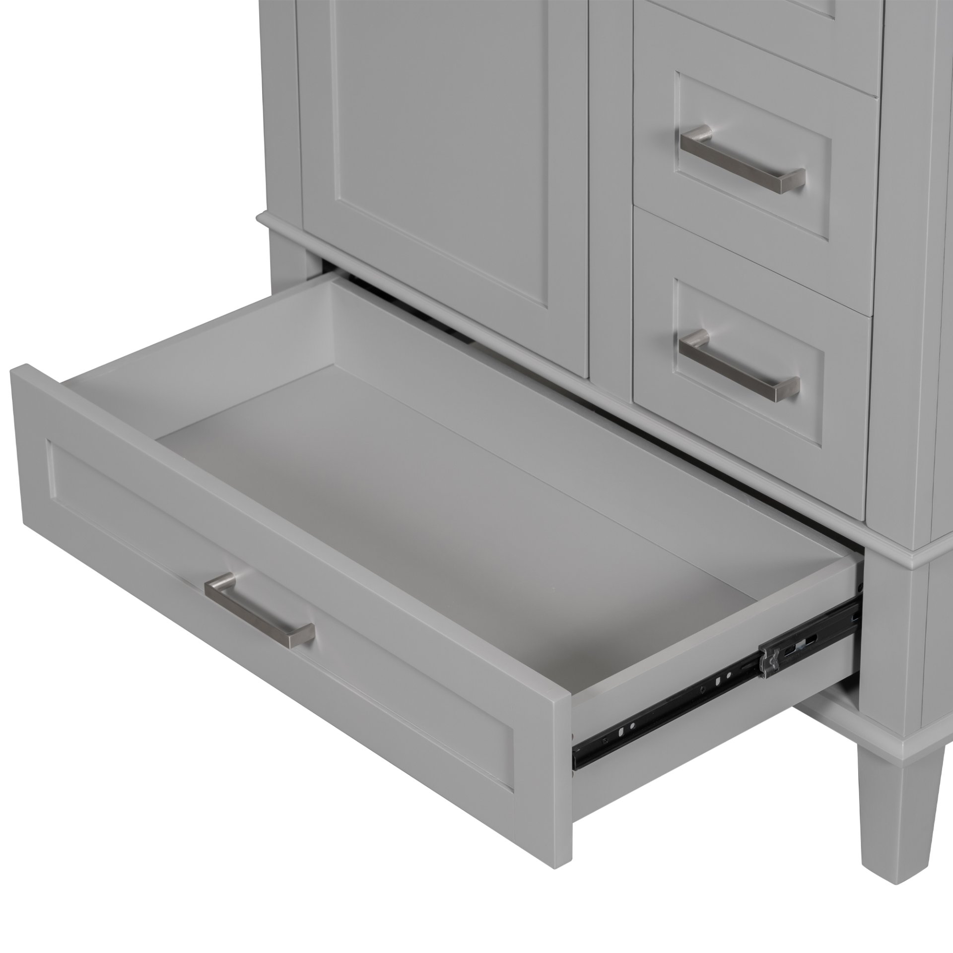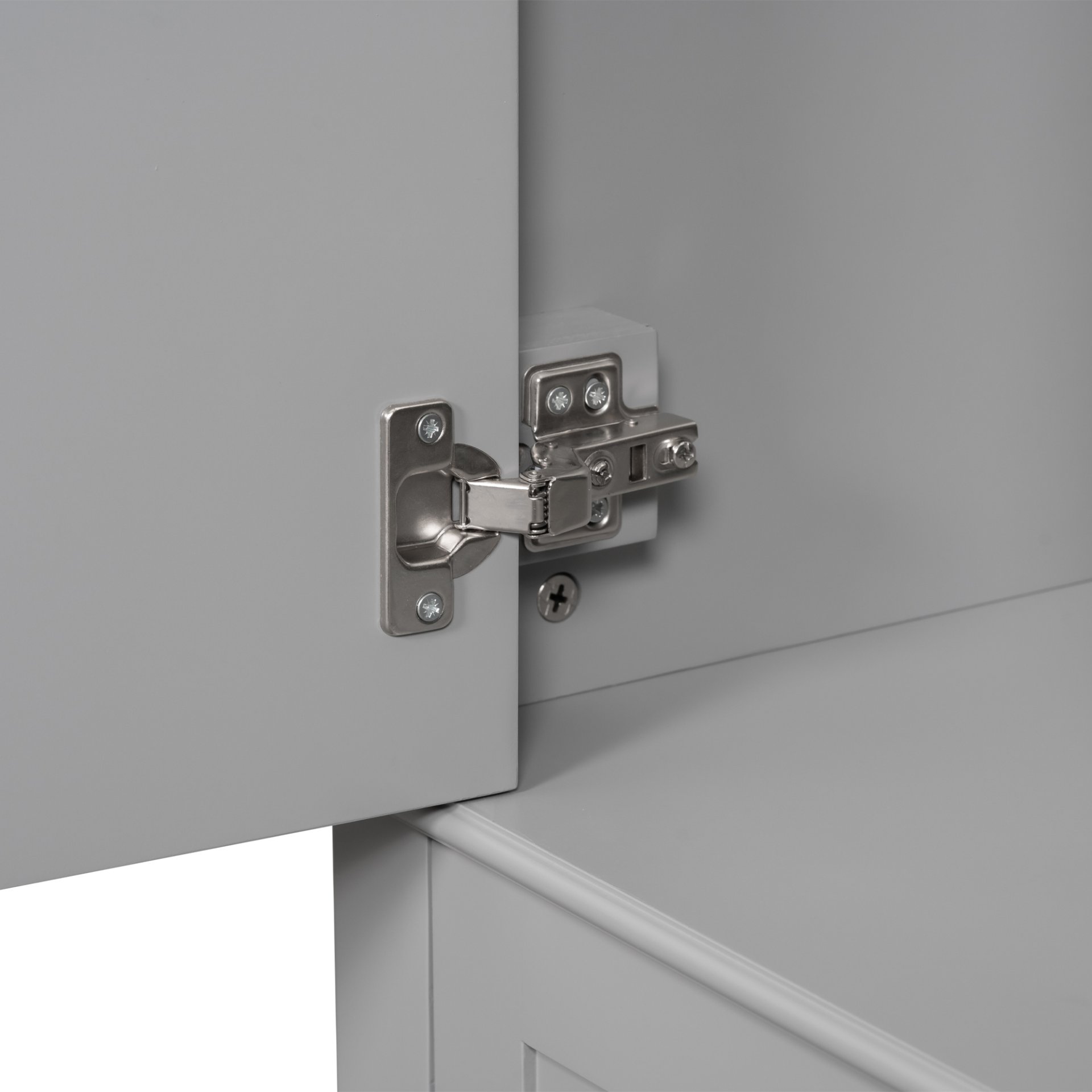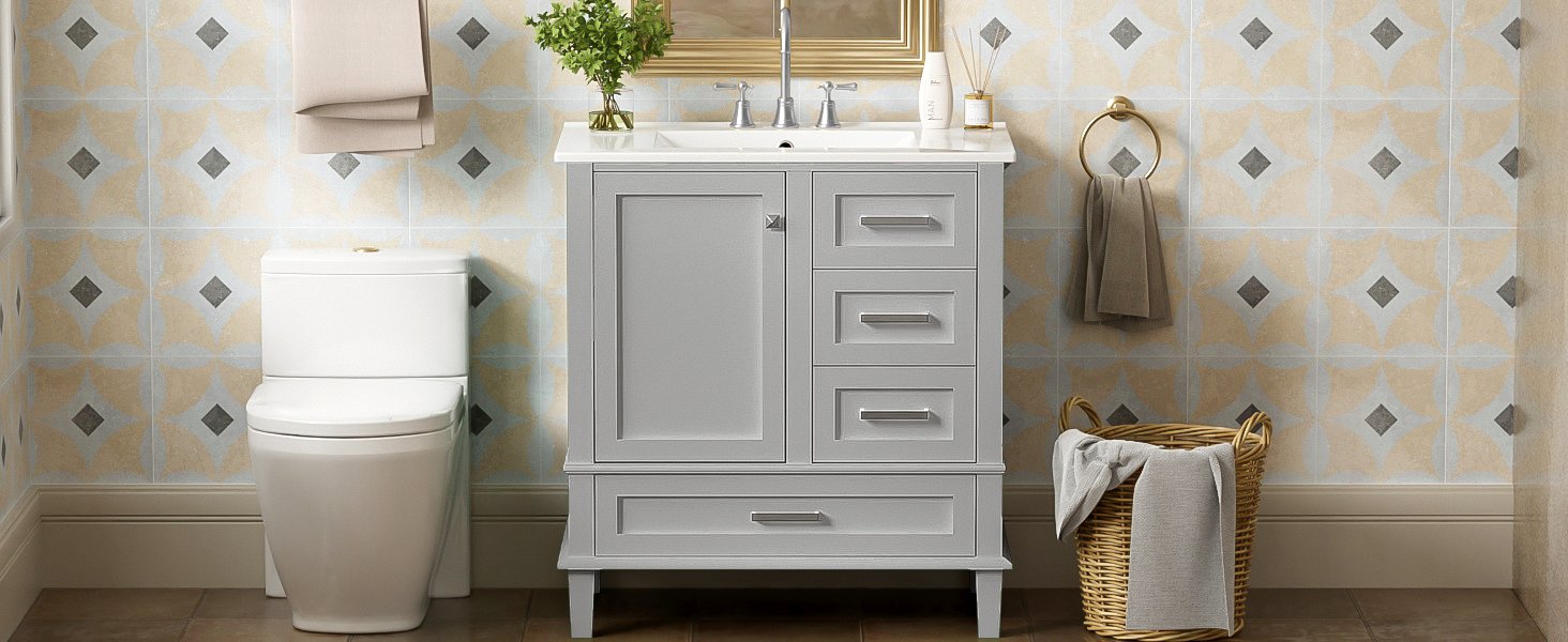 • Elegantly Modern Design: The grey cabinet with a white countertop creates a refreshing color combination that catches the eye.