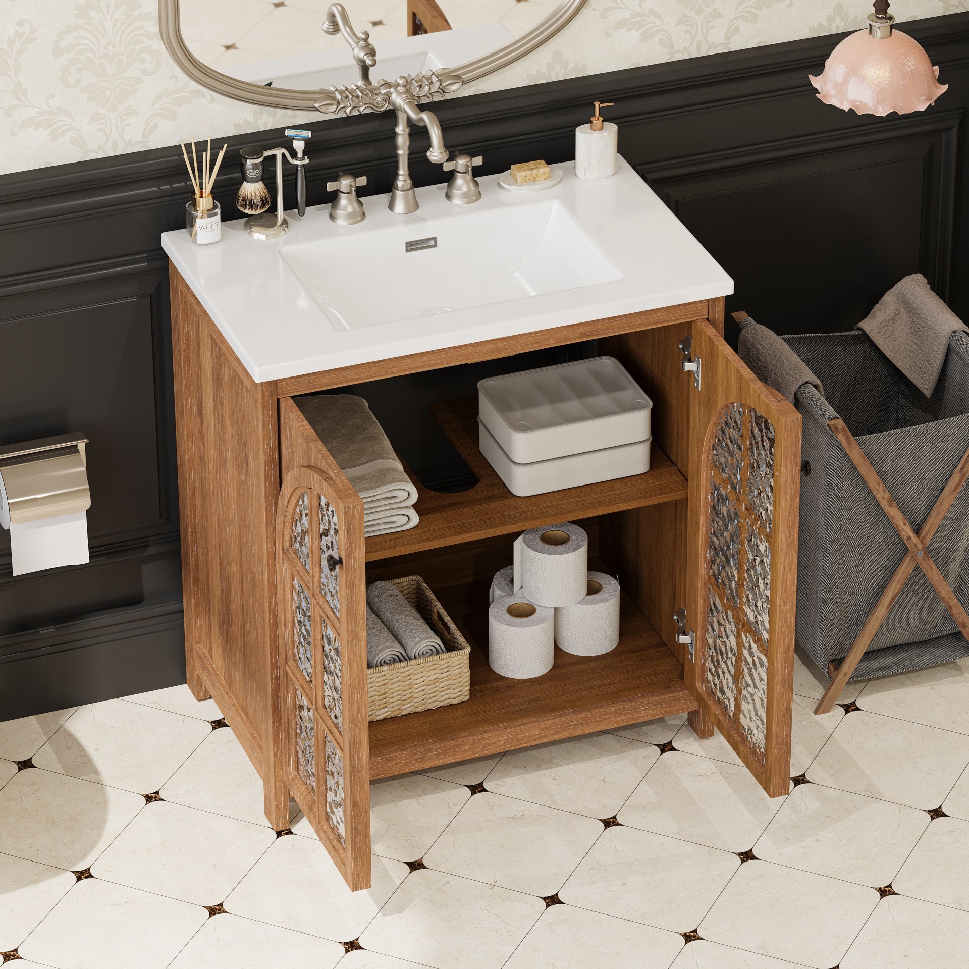 • Adjustable Interior Shelf: Offers flexible storage options to organize toiletries, towels, or cleaning supplies efficiently.