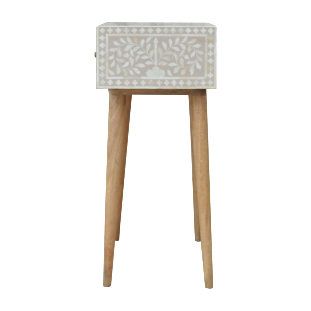 • Taupe Floral Bone Console - The beautiful console table has been constructed from 100% solid mango wood and features 2 spacious drawers made with a floral bone inlay which has been painted in a light taupe colour and finished with a oak-ish finish base and legs. It can be used as an accent piece in the home or be partnered with the other bone inlay pieces.