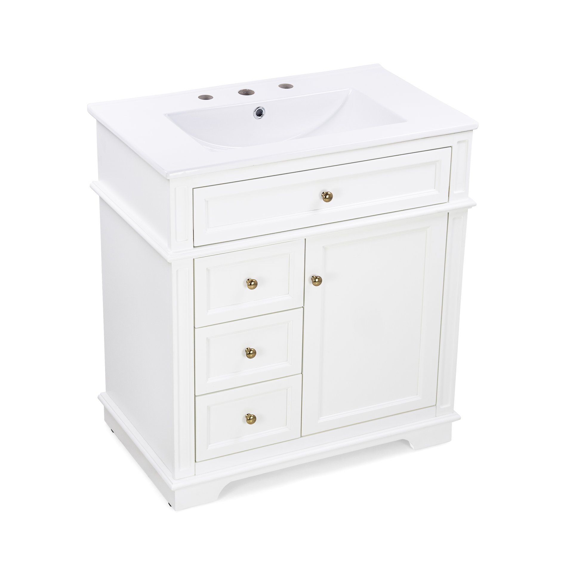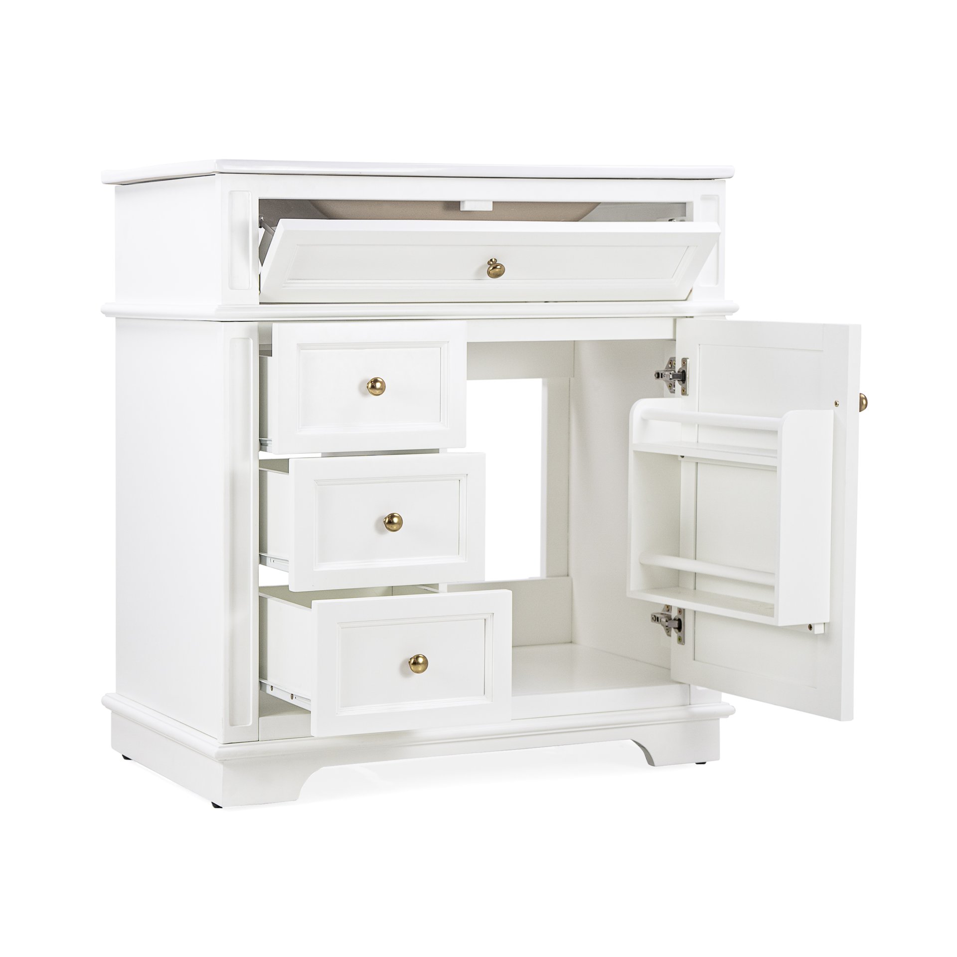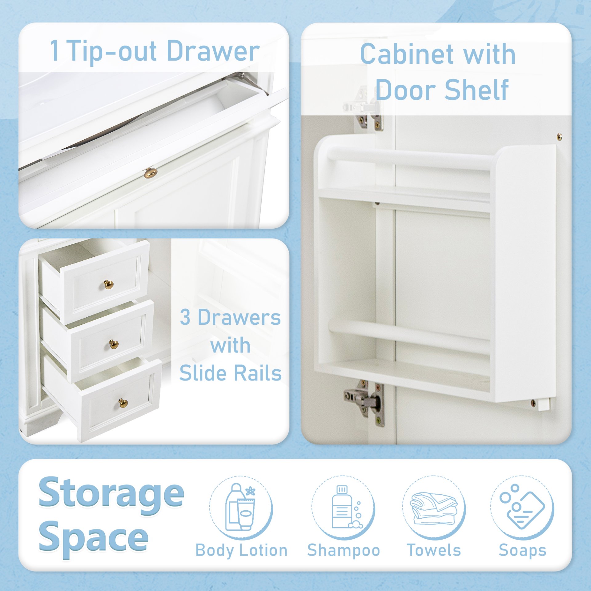 • Vanity with Storage: Includes a cabinet with door shelf, one tip-out drawer, and three slide rail drawers for ample storage.