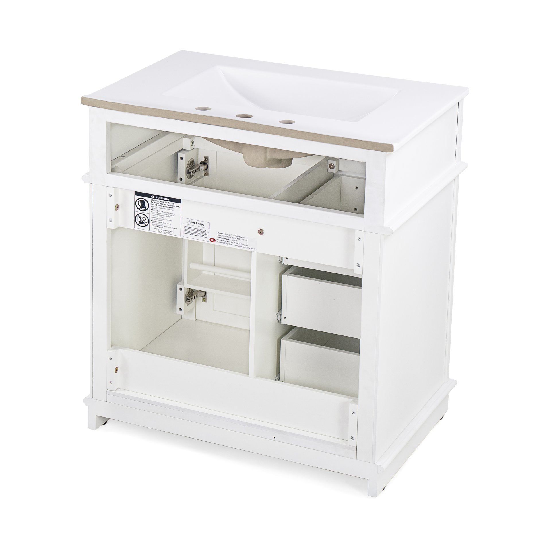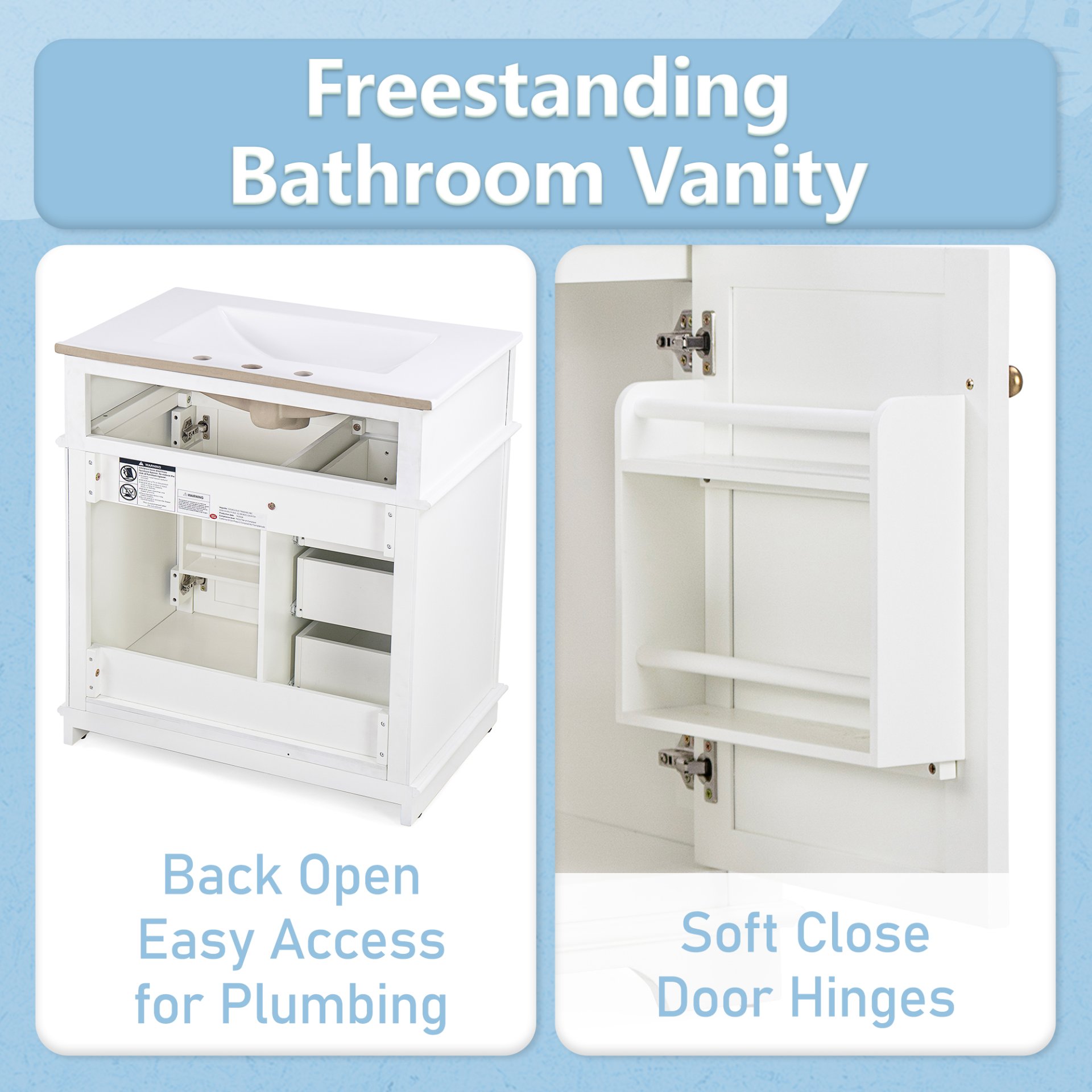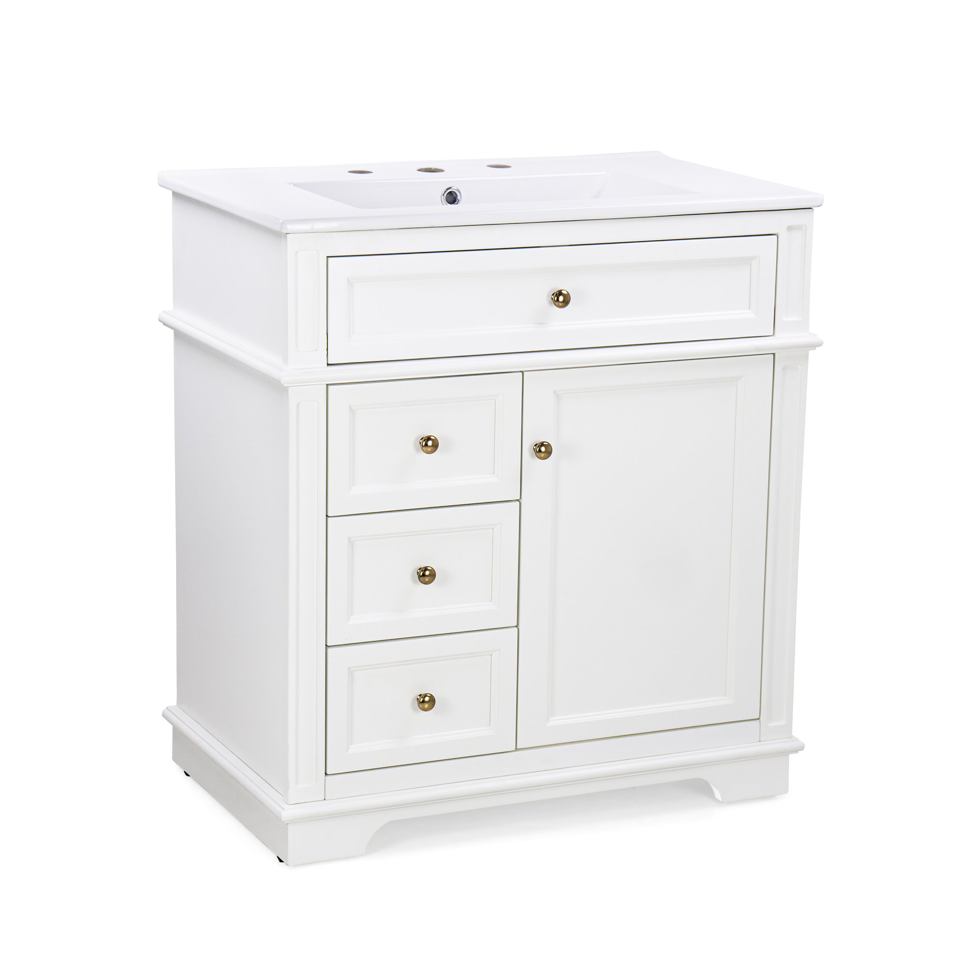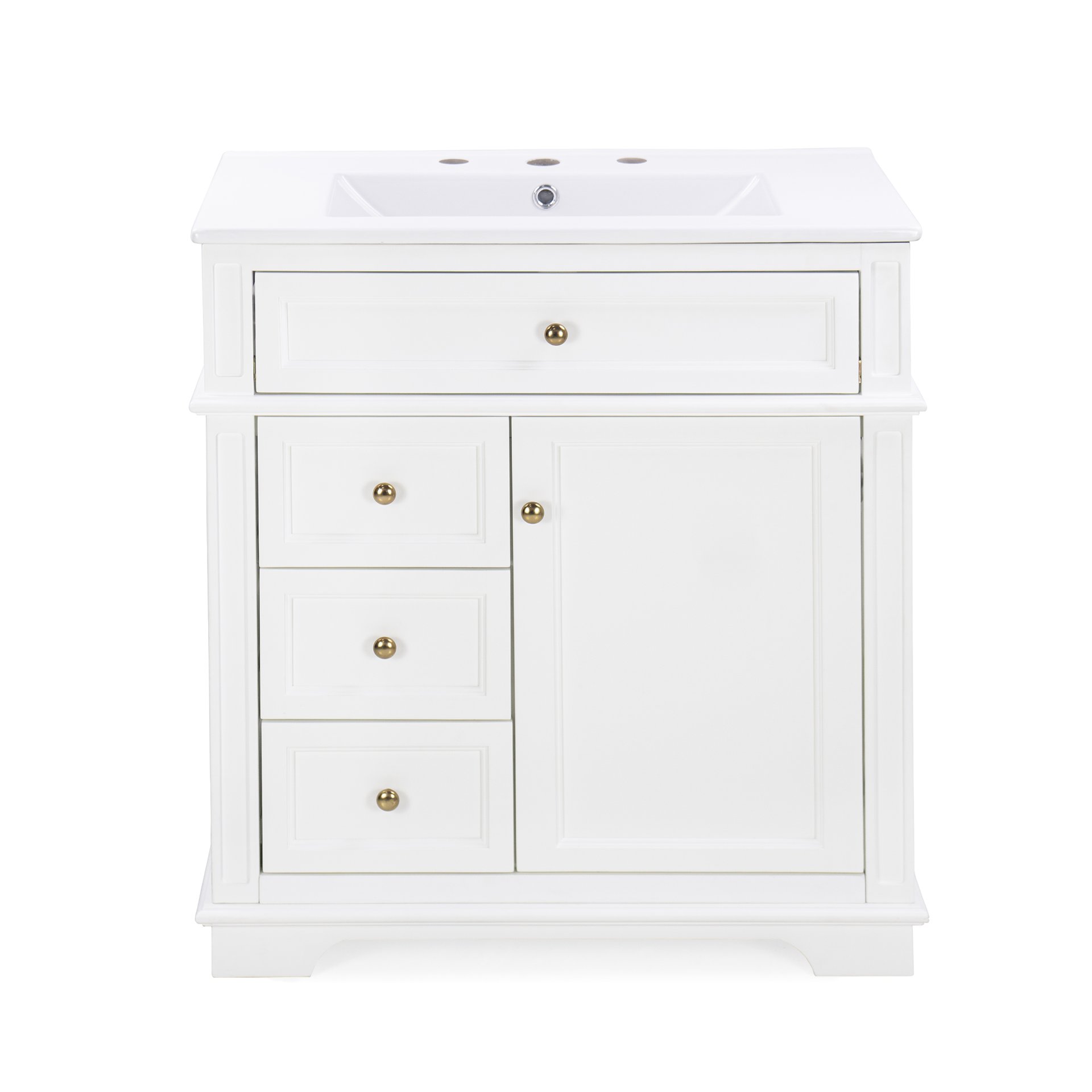 • Vanity with Storage: Includes a cabinet with door shelf, one tip-out drawer, and three slide rail drawers for ample storage.