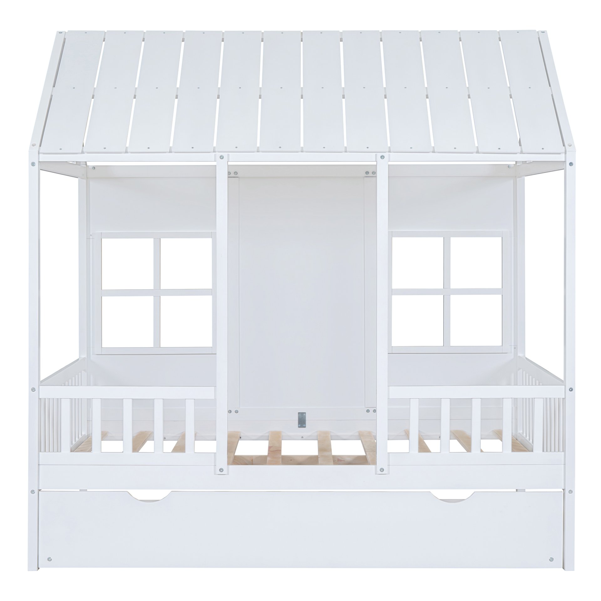 Take your children's bedroom to the next level with this Full Size House Bed with Twin Size Trundle that not only saves space, but creates an exciting atmosphere for your kids. Featuring a playhouse-inspired window, this bed doubles as a play place perfect for kids to study, watch TV or explore their imaginations. Enjoy this bed for years to come with its durable build, manufactured with quality lumber and pinewood to withstand horseplay, scratching and other untimely wear. Comes complete with thick slats to preserve the life of your mattress.