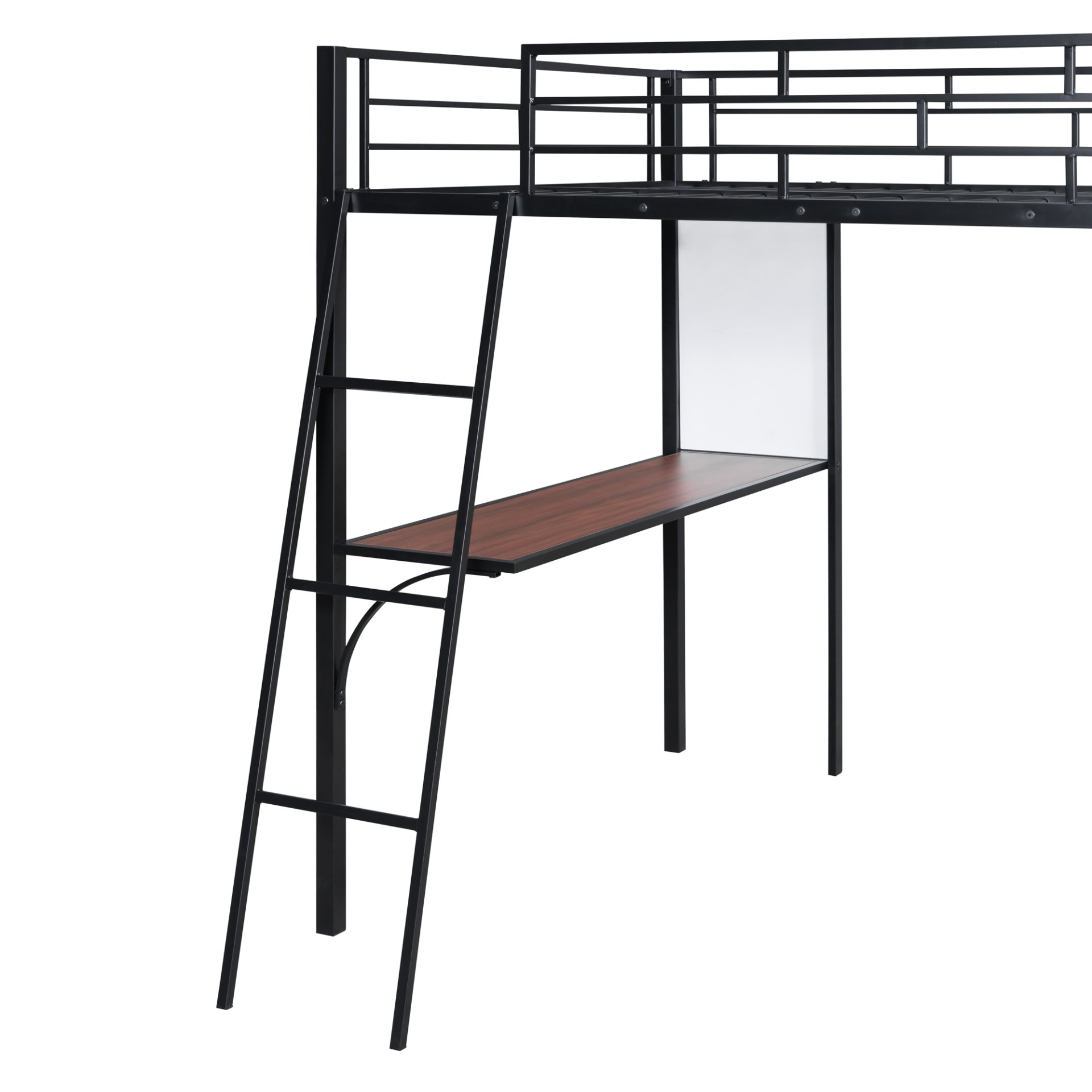 Crafted of metal in a clean painted finish, this loft bed features a sleek, modern design with slatted guardrails. The three open shelves provide ample space to organize and display your essentials. Equipped with a spacious desk and a whiteboard underneath, this bed creates a comfortable and functional space for work, reading, and relaxation. A beautiful and practical addition to any bedroom.