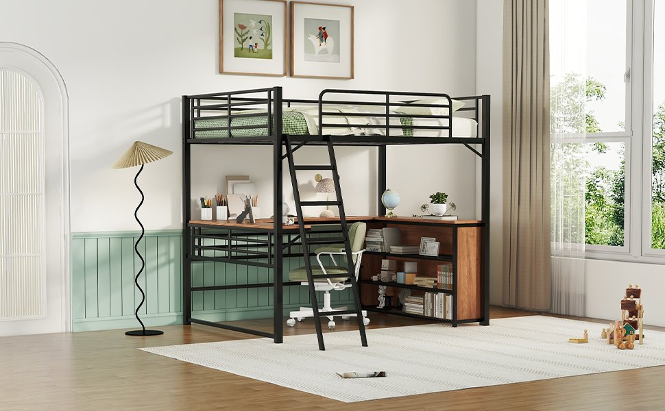This stylish metal loft bed with a desk is made from sturdy metal and features a clean-cut silhouette that complements any room décor. Designed with safety in mind, this loft bed comes with a ladder that is interchangeable for both left and right sides, making it easy to climb up and down. The 3 layers of shelves underneath the desk provide ample space to create extra room when needed, ideal for storing books, toys, or other small items. Some assembly is required, but the bed is easy to assemble.