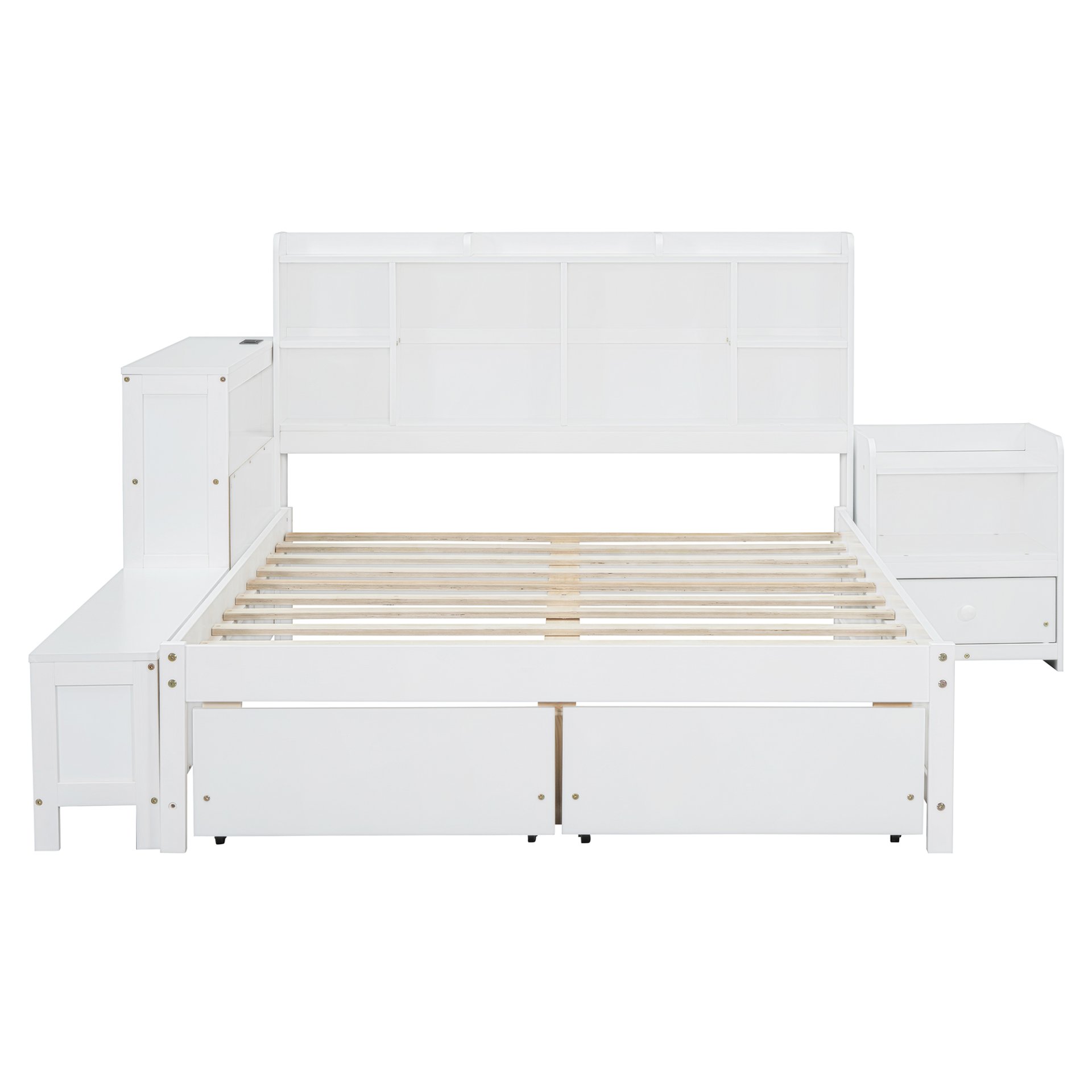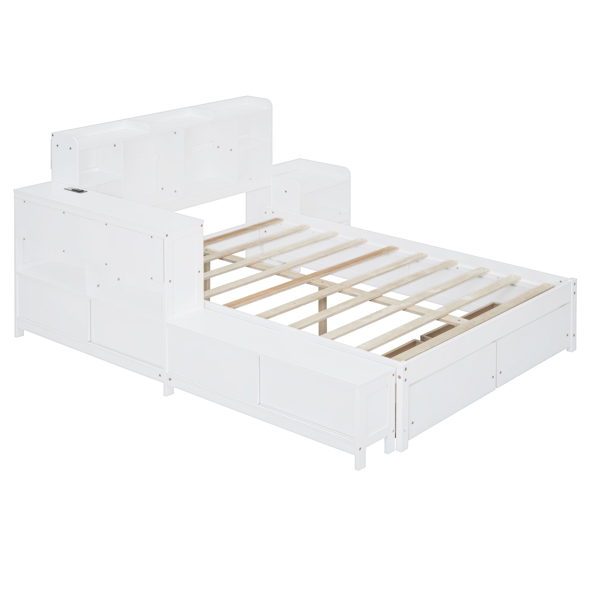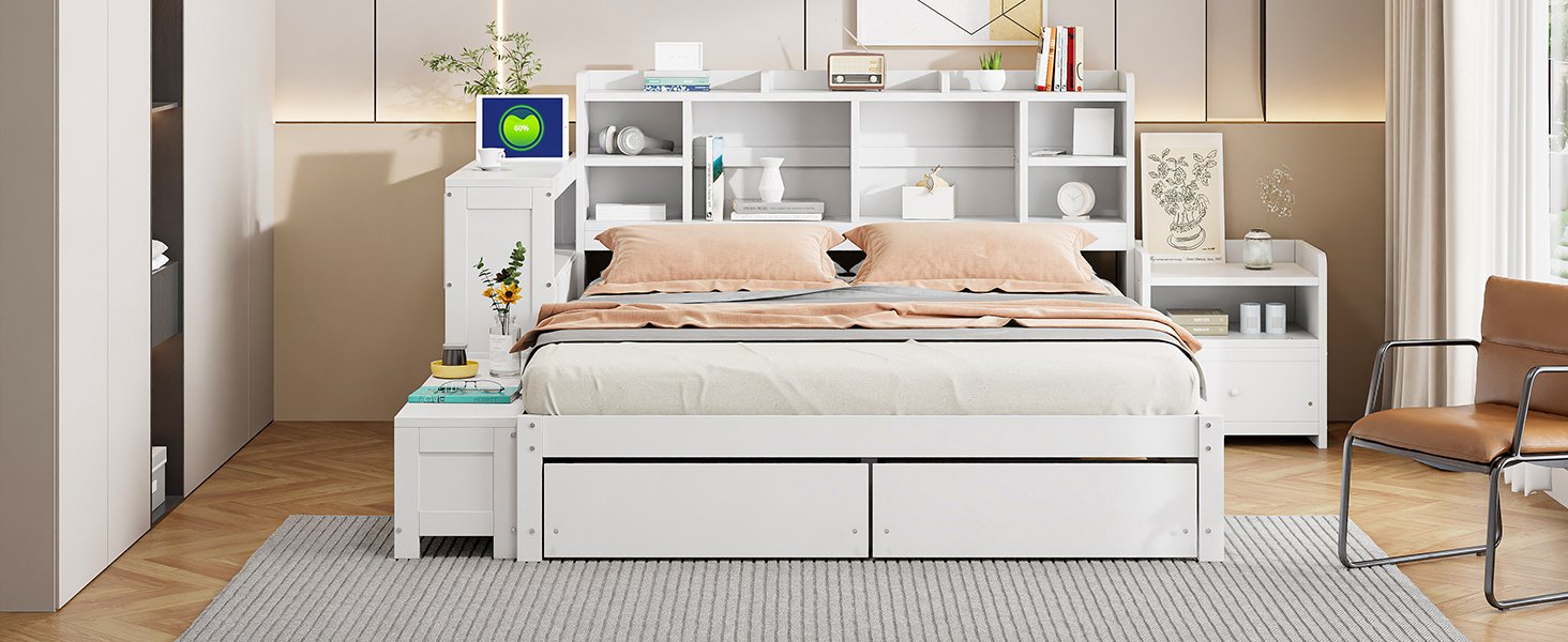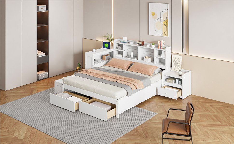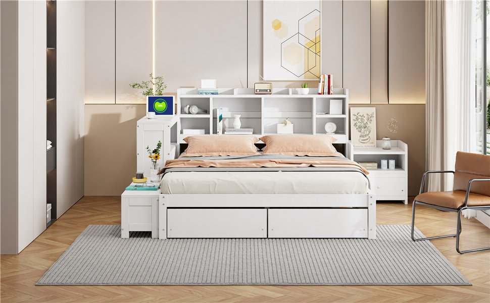 Transform your bedroom with this sleek and functional wooden platform bed, designed to combine style and practicality. Featuring a headboard with multi-size storage compartments for your essentials like clocks, glasses, and phones, this bed keeps your items within easy reach. A built-in desk on the side offers a convenient space for work or study, with a USB charging port to ensure your devices stay powered up. Below the desk, ample storage options are available. The bed also includes a nightstand, and two storage drawers at the foot of the bed to meet all your daily storage needs. With this multi-functional design, enjoy a clutter-free and convenient living space.