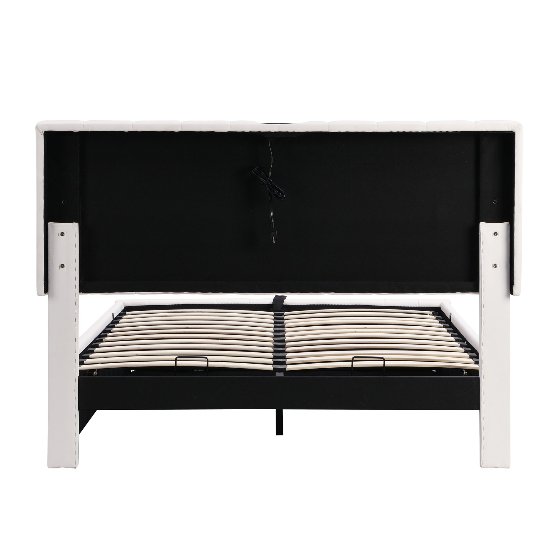 This beautiful upholstered platform bed features a modern hydraulic storage system and sensor lights, adding a contemporary chic look to your bedroom. Filled with thick foam for extra comfort, our platform bed frame is equipped with the latest RGB light bars, offering 16 colors and four lighting patterns. The colorful lights enhance your space, and you can easily change them with the remote control. The hydraulic storage system underneath the mattress allows you to store quilts, bed sheets, and other necessities, making it perfect for smaller spaces without compromising bed size. Additionally, a set of two sockets and USB ports above the headboard adds convenience.