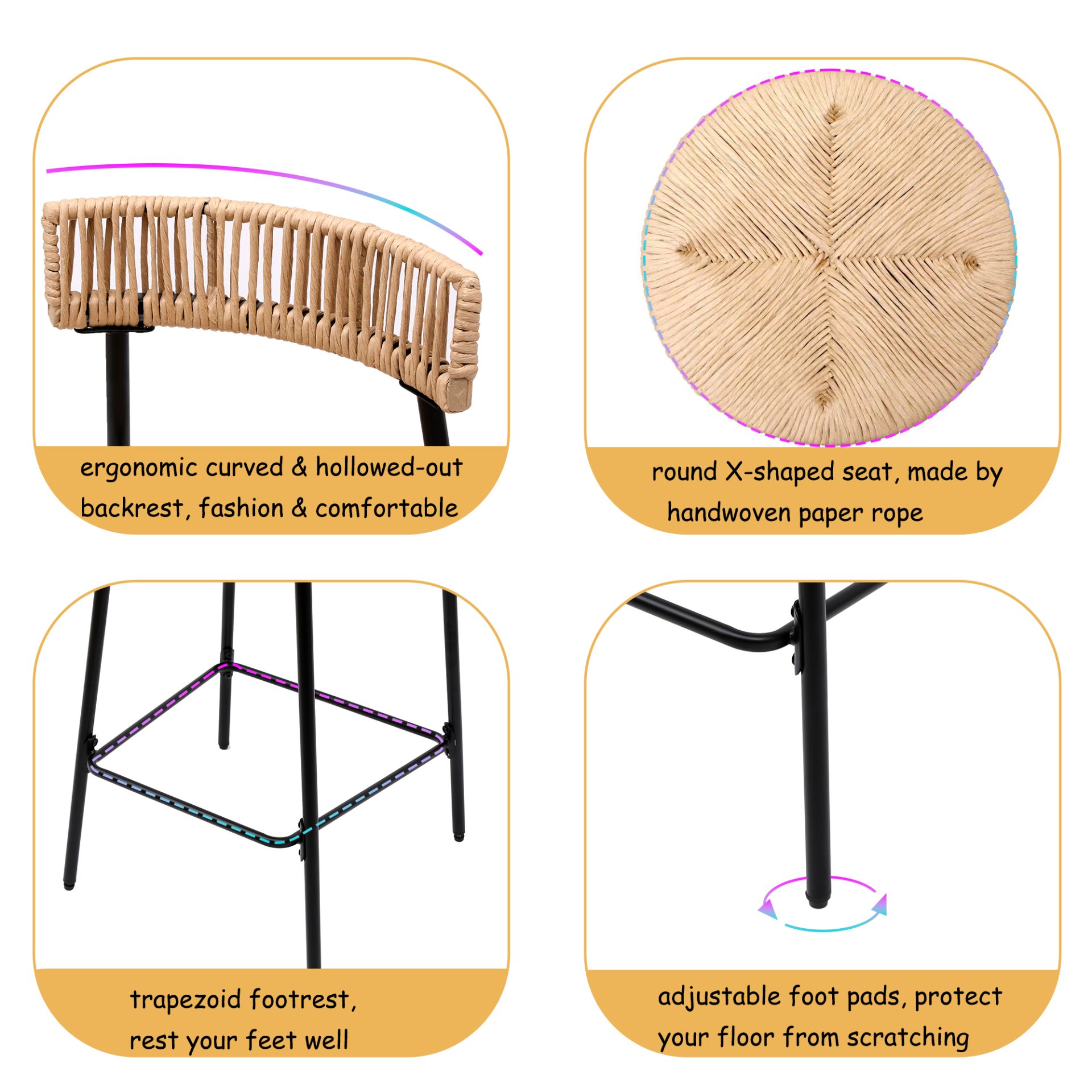 • Sturdy and Long-Lasting: Our bar stool has a durable black metal frame and a strong paper rope seat, complete with non-slip pads to protect your floors.