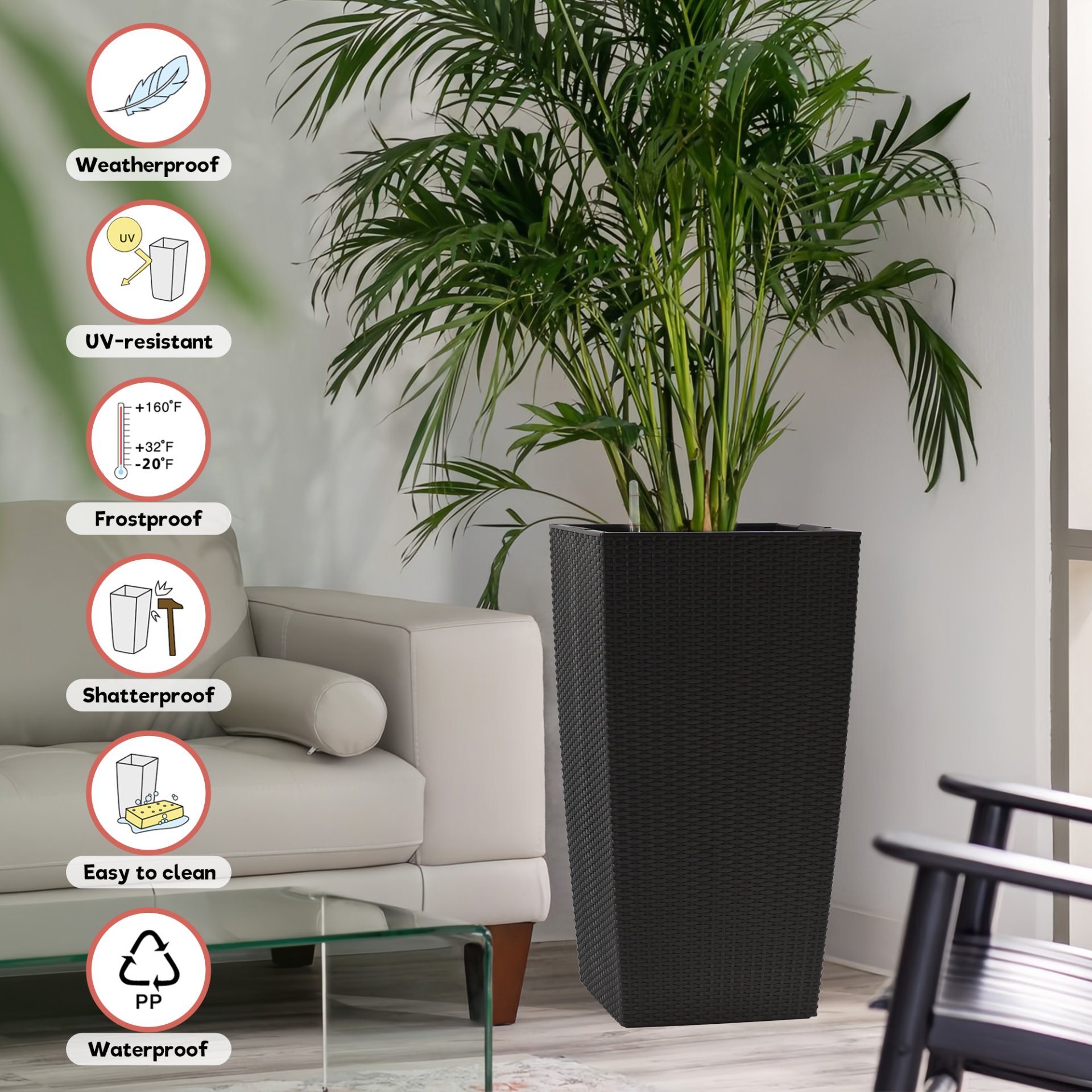 • Weather Resistant: Constructed from rigid PP plastic with protection against sun, rain, and cold climates.