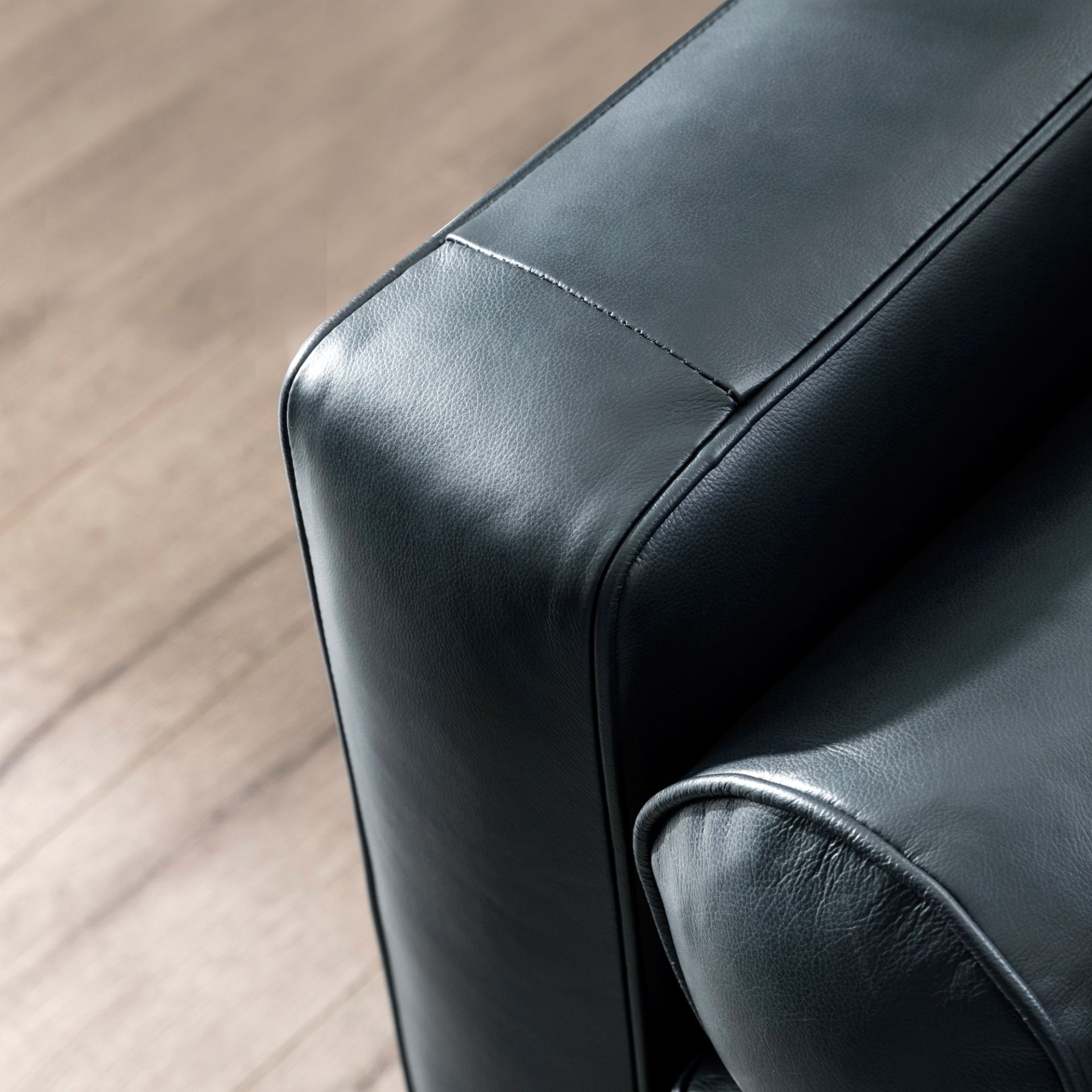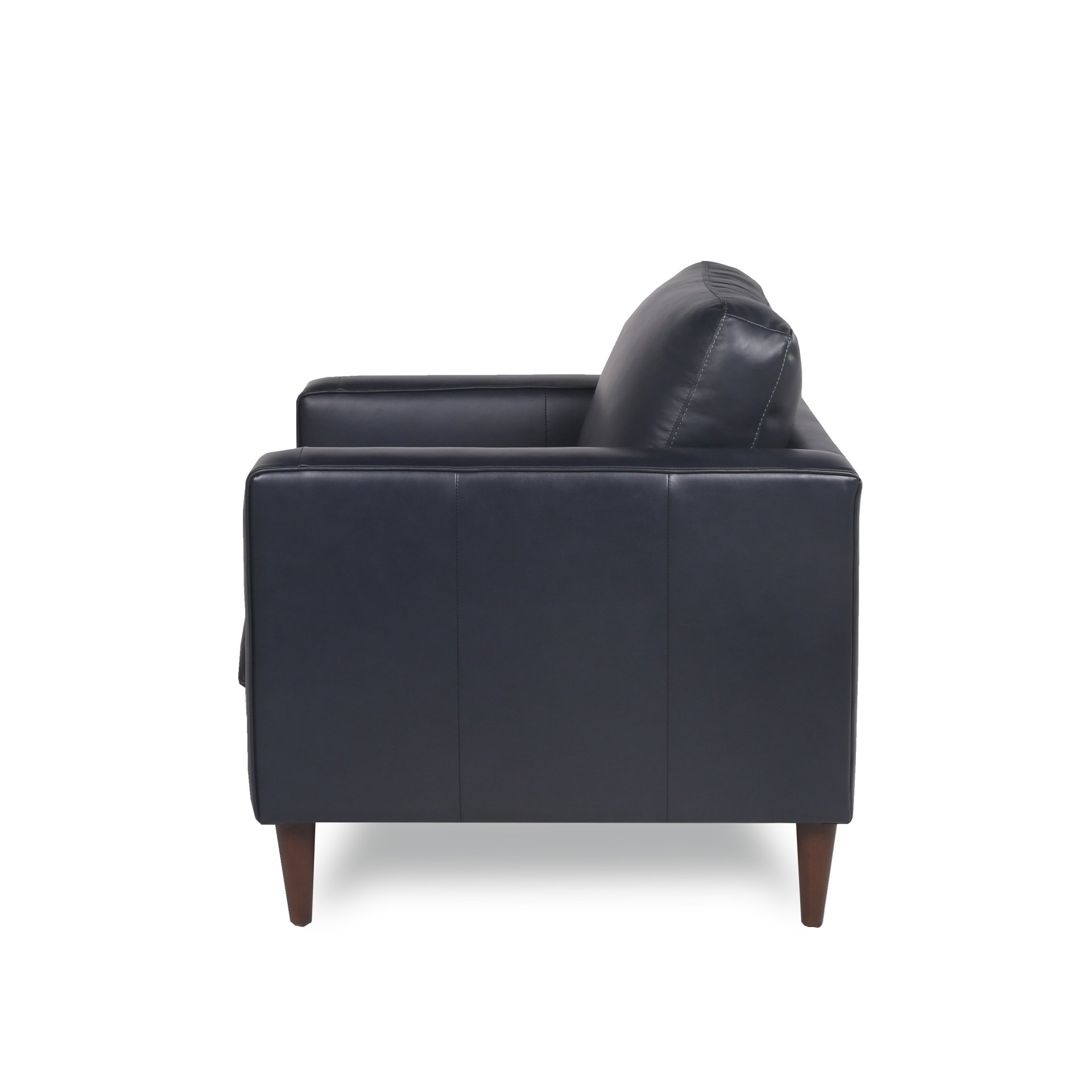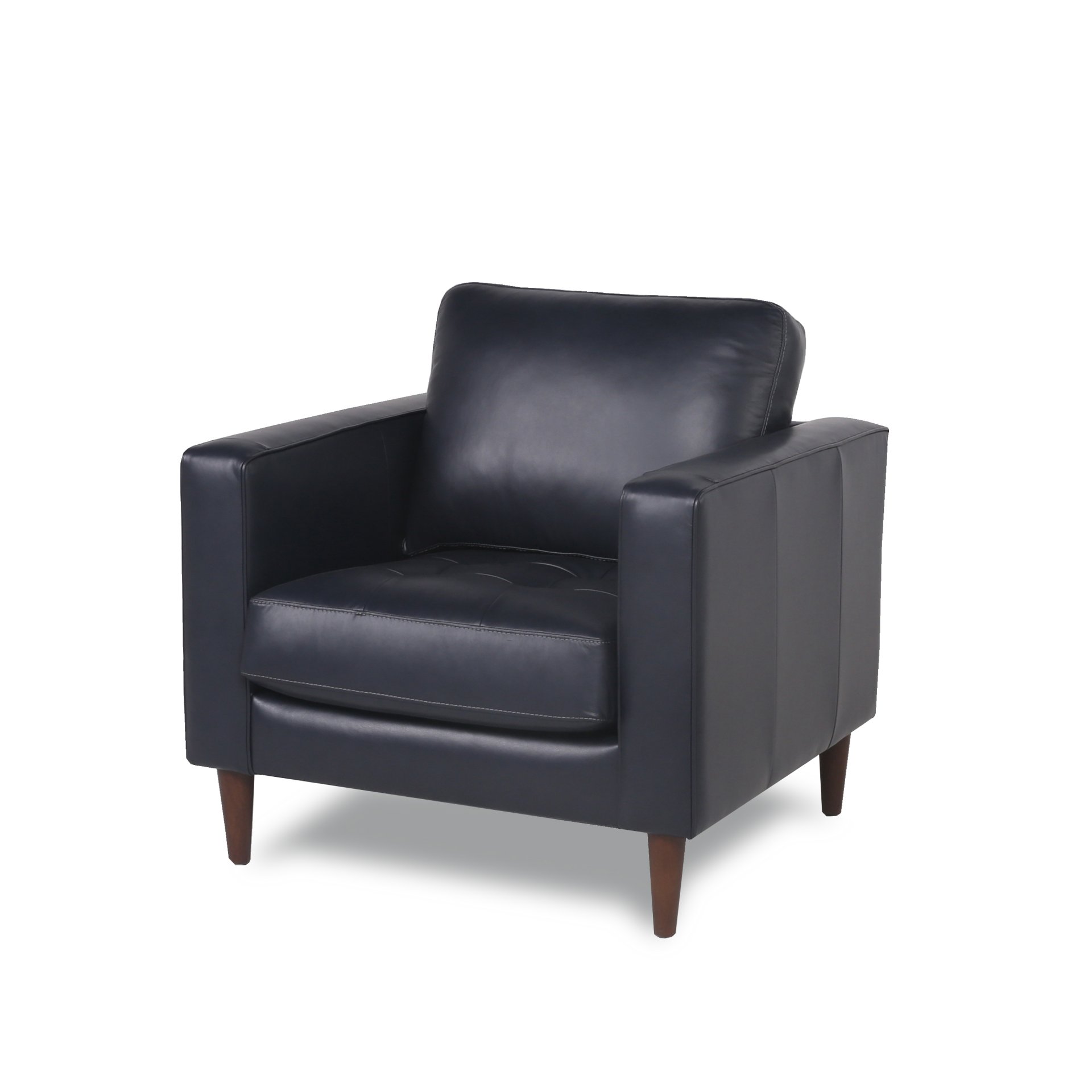 Refined architectural lines and a nod to the mid-century styling showcases this chair's uniquely simple yet sleek design. This small-scale chair offers a chic and current look by featuring a tufted seat cushion with stunning topstitching detail. The modern chair features narrow track arms and recessed turned legs adding modern simplicity with maximum seating capacity. The collection is expertly tailored and will become the centerpiece of your living room, den, urban loft, condo, or home office. Removable legs allow for simple delivery for tight spaces. All cushions are removable.