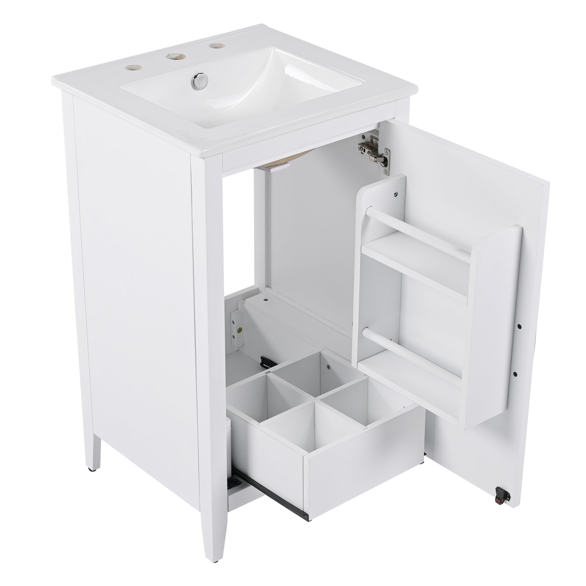 • Vanity with Storage: Includes a cabinet with a door shelf and a functional drawer for flexible storage solutions.