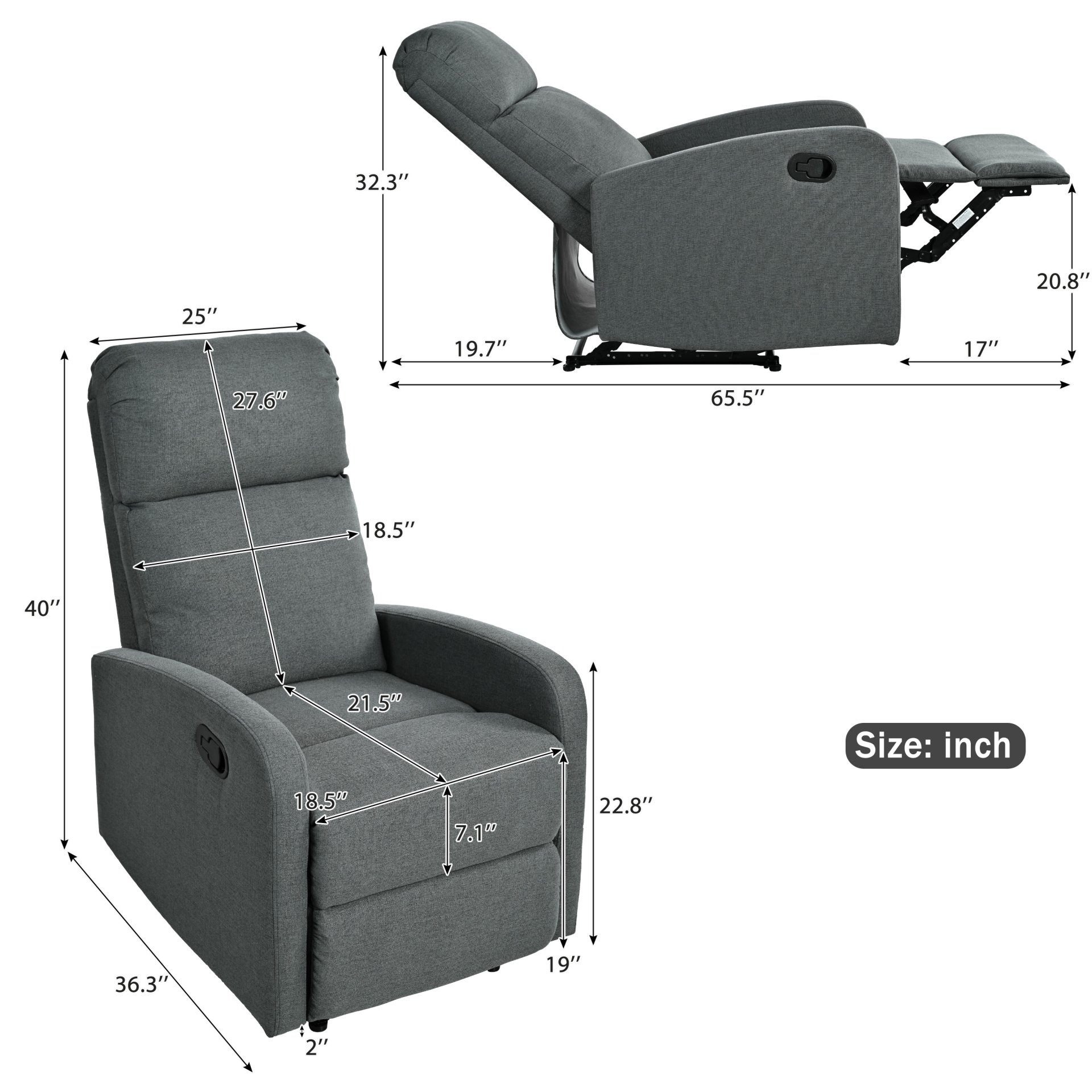 • Three Adjustable Recline Angles: Features a manual push-back mechanism with positions at 105°, 120°, and 150° for personalized relaxation.