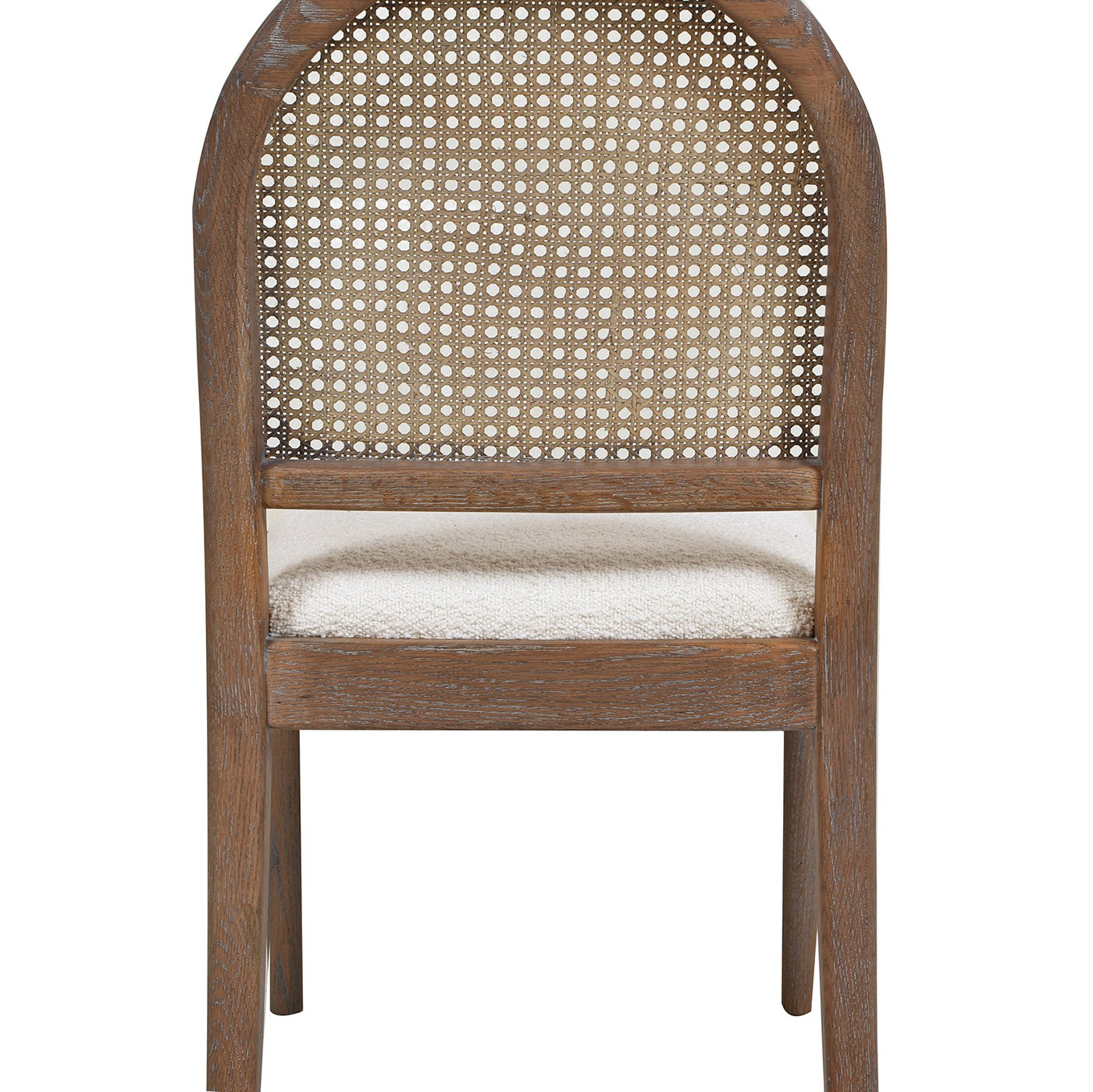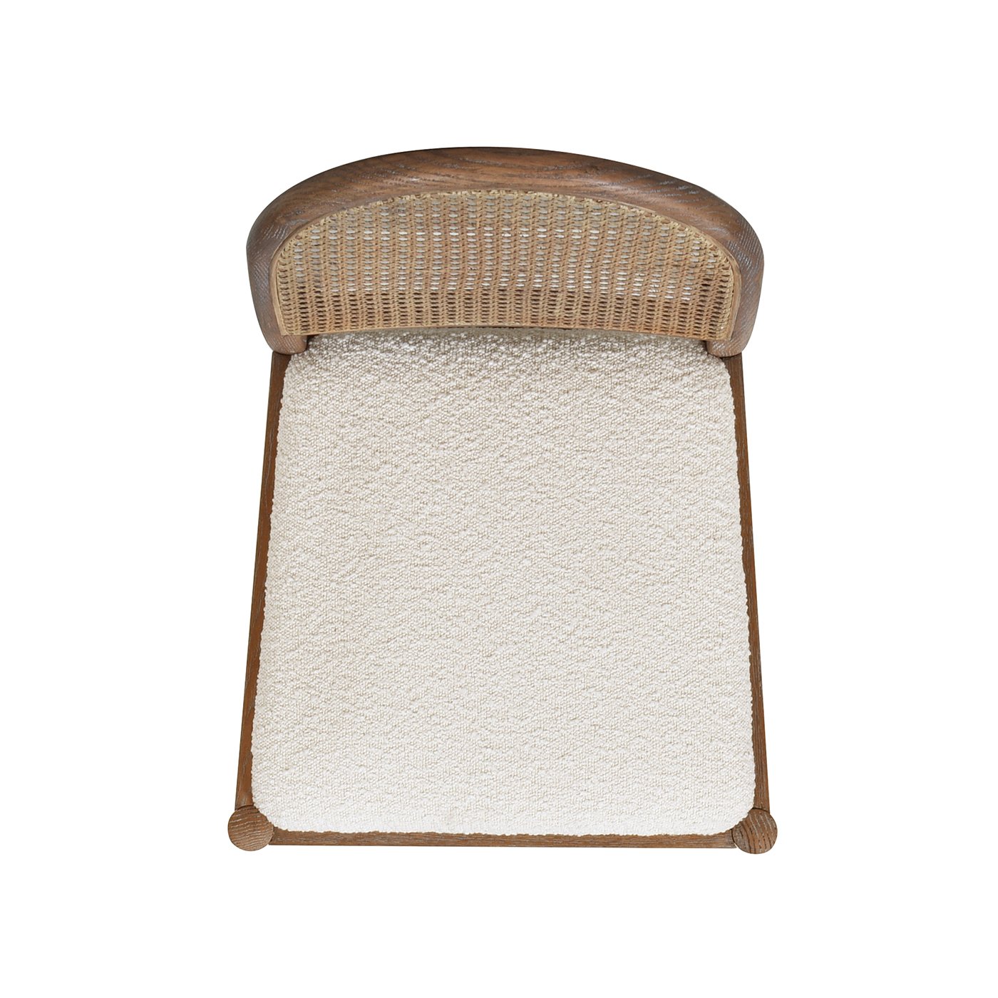 • Comfortable Upholstery: Upholstered in off-white boucle fabric with a tweed, faux lambskin texture, these chairs provide both comfort and a plush aesthetic.