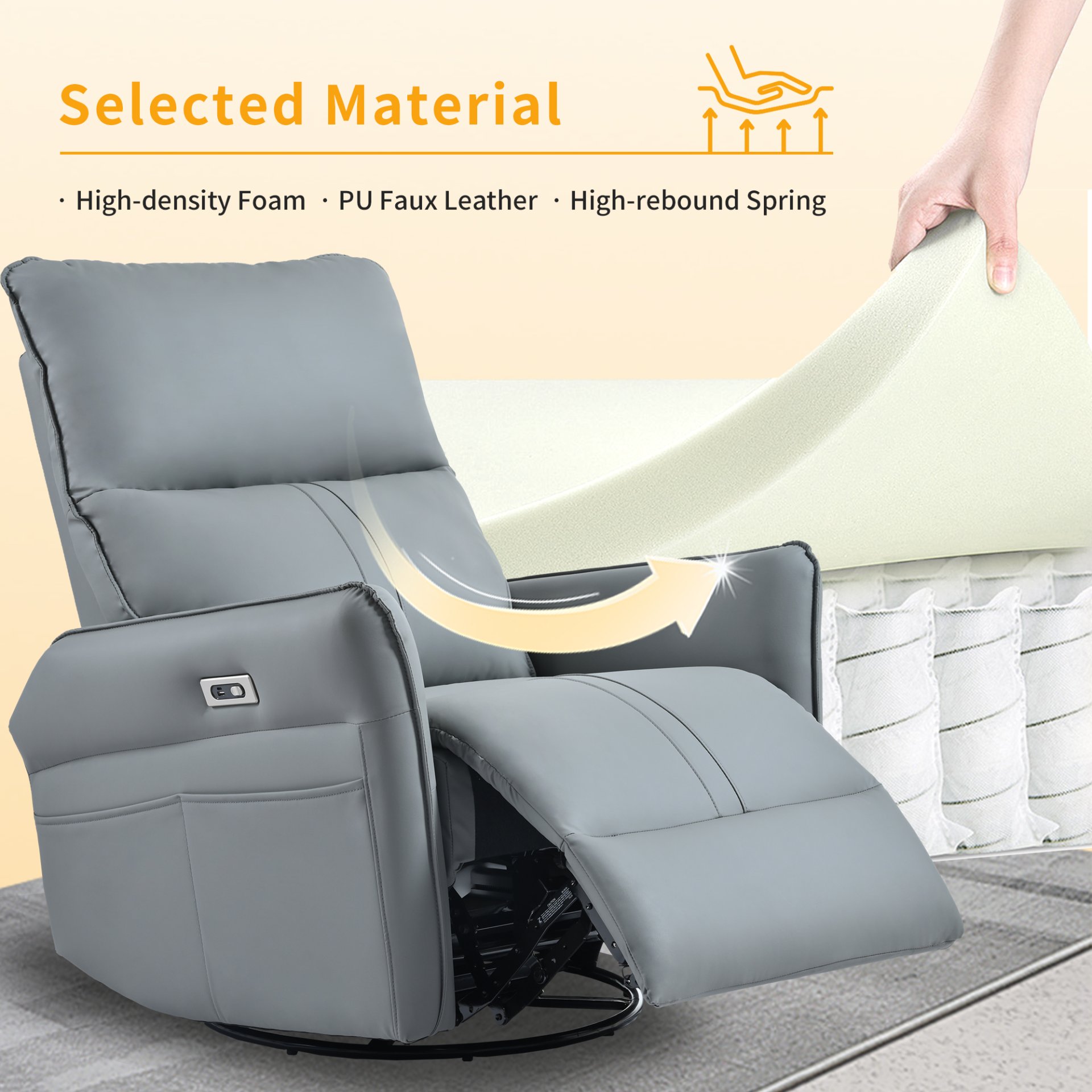 • Adjustable Comfort: This chair offers a 270° swivel, 30° rocking, and a 95-150° reclining angle for maximum flexibility. Easily adjust settings with a button, and enjoy convenient access to two side pockets for remote controls or magazines.