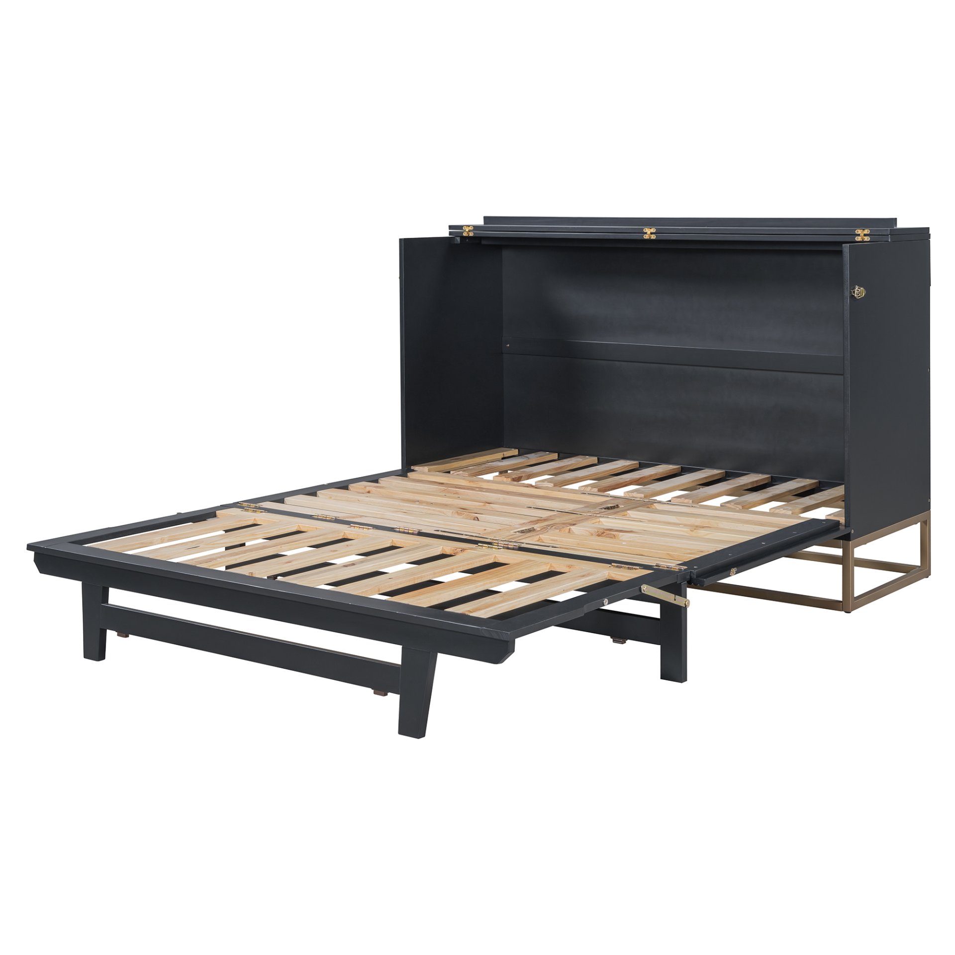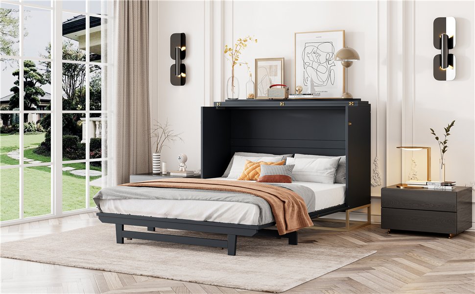 This stylish Murphy bed blends modern design and functionality. With vertical frosted glass on the left and a faux three-drawer look on the right, it easily folds out into a full bed, saving space. Built from durable pine wood and MDF, it features gold metal handles and legs for added elegance. Available in white, gray, and black to suit any décor.