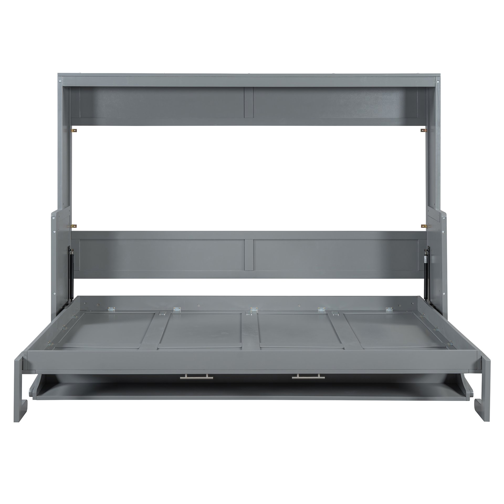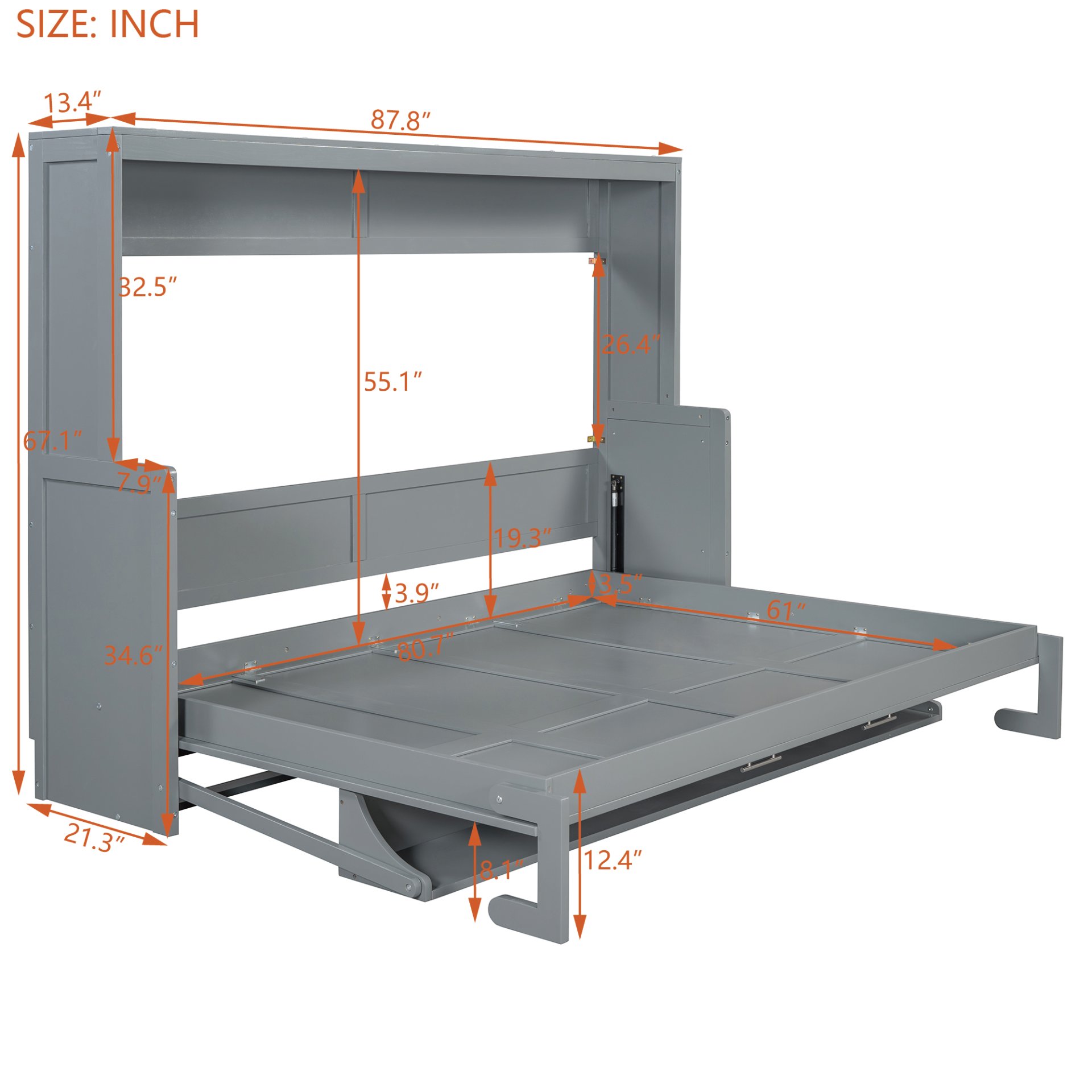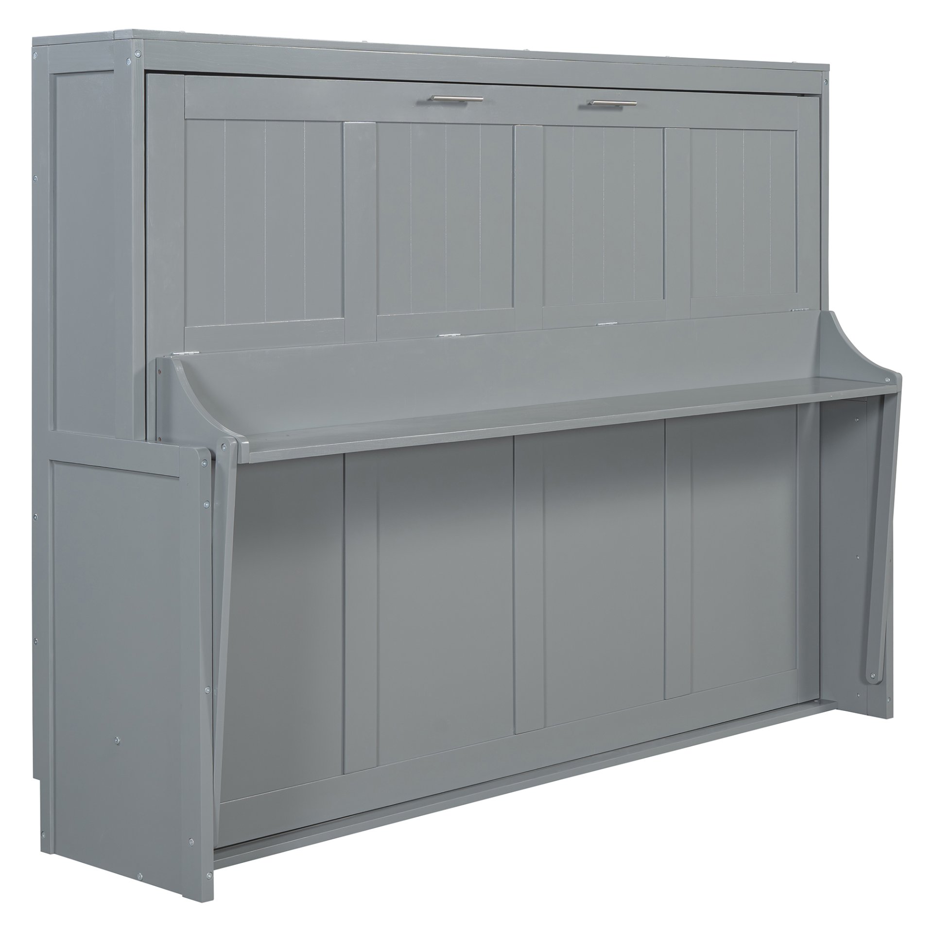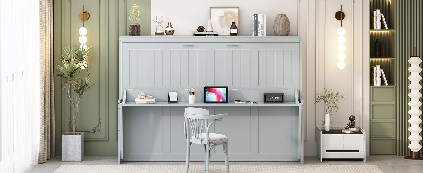 The Full/Queen Wall Murphy Bed is a space-saving solution that combines a bed and desk. With hydraulic hinges, the desk folds away when the bed is pulled down. Available in washed white and washed gray, it fits various décor styles. The sturdy frame supports up to 600 lbs for durability and comfort. A built-in storage space lets you store both the bed and mattress together, keeping your room tidy. Recommended for use with a 10-inch mattress (not included), this Murphy bed is perfect for small spaces.