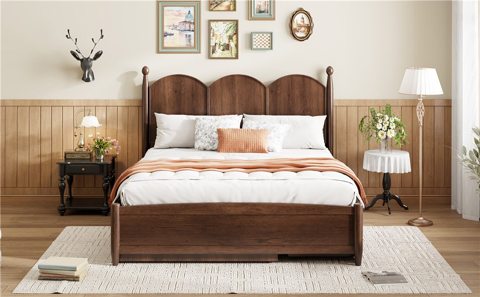 Rustic Design: This elegant bed features a curved headboard and four rounded pillars, blending classic sophistication with modern design for a timeless look. Perfect for adding style and comfort to any bedroom.