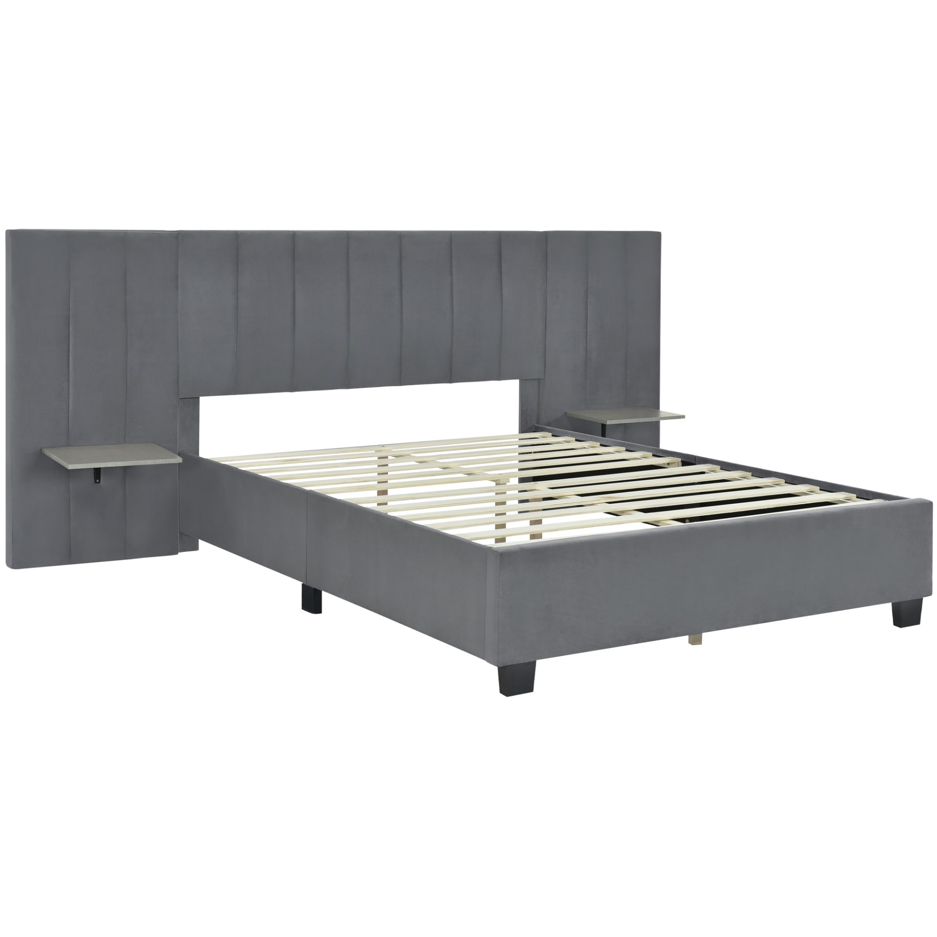 Enjoy the ultimate in comfort with the oversized and ultra-soft headboard, providing a cozy backdrop for relaxation. Additionally, the integrated shelves on both sides of the headboard offer convenient storage for your bedside essentials, keeping them within easy reach. With its sleek and contemporary design, this bed seamlessly blends style and functionality, creating a tranquil and inviting atmosphere where you can unwind and rejuvenate in comfort.