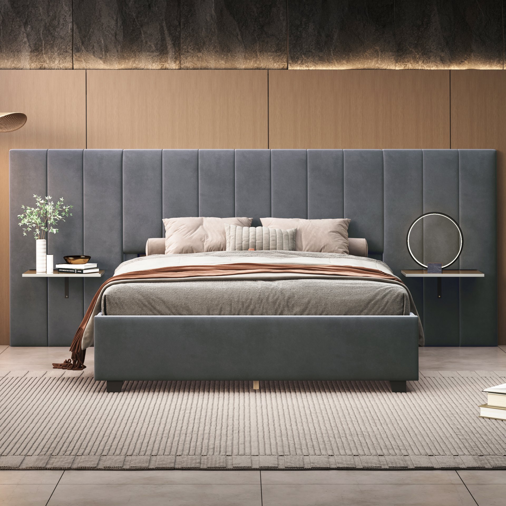 Key Features: Enjoy the ultimate in comfort with the oversized and ultra-soft headboard, providing a cozy backdrop for relaxation. Additionally, the integrated shelves on both sides of the headboard offer convenient storage for your bedside essentials, keeping them within easy reach.