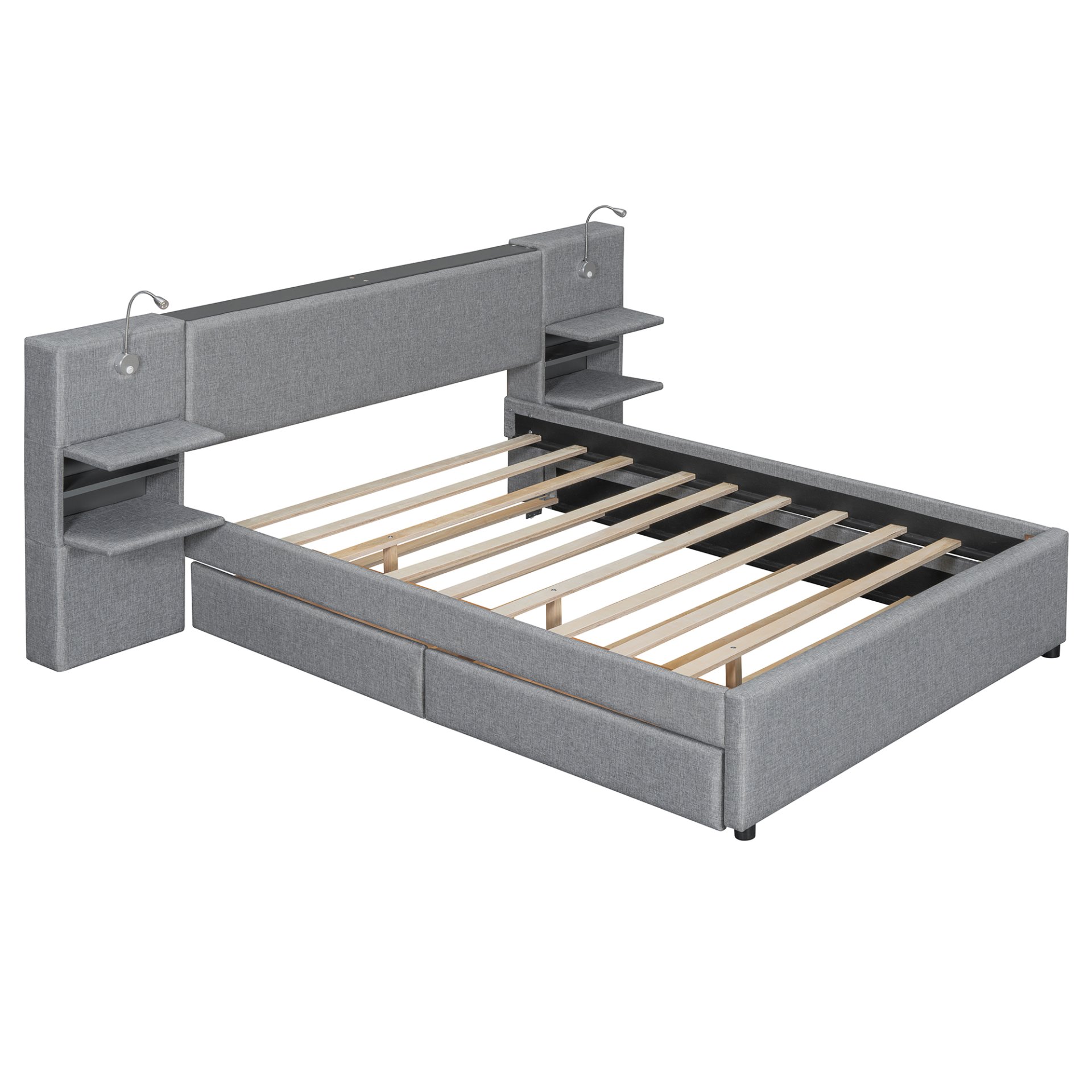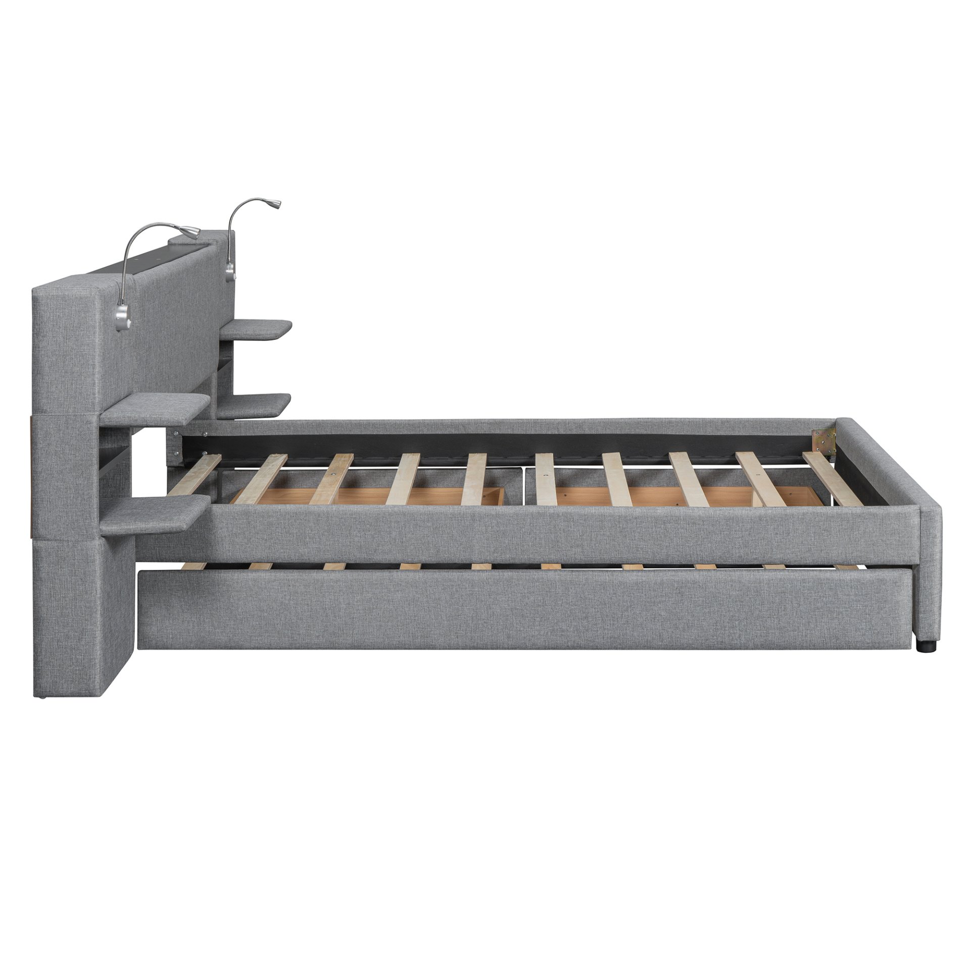 Elevate your bedroom with the perfect blend of style, functionality, and comfort with our Queen Size Linen Upholstered Platform Bed. Crafted with a durable and breathable linen fabric, this bed offers a sophisticated look and feels luxurious to the touch. The spacious headboard features two built-in adjustable reading lights, making it easy to read or relax in bed without disturbing others. With added features like a flip-up storage headboard, side storage racks, under-bed drawers, and a convenient trundle, this bed is designed to meet all your storage needs while keeping your space tidy and organized. Perfect for those who want both comfort and practicality, it’s the ideal choice for modern living.