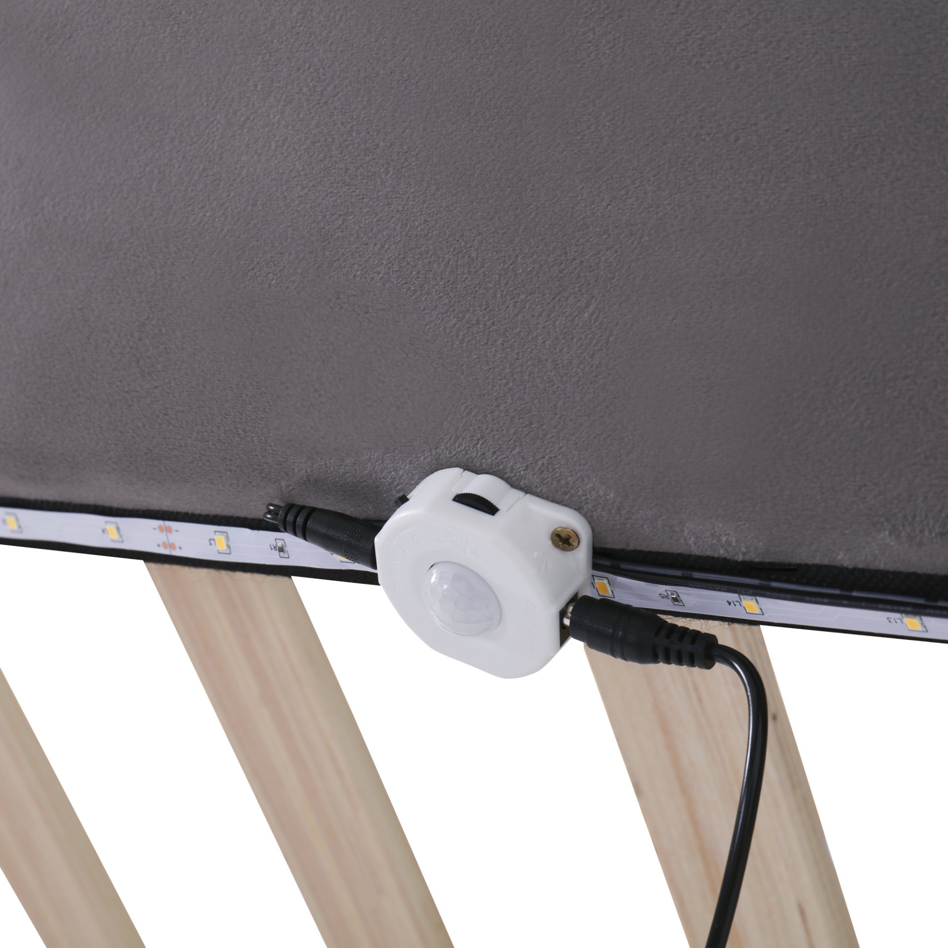 This stylish Upholstered Platform Bed features the latest Sensor Light design, adding a contemporary chic look to your bedroom. Our motion sensor light, with built-in sensors, can automatically turn on or off as someone moves around, making it a perfect choice for saving power. The unique bed design gives the appearance of the bed floating. The sturdy wood frame construction ensures extra stability and safety. There are 2 sets of USB ports and sockets on each rear bed leg, providing electricity for the light alongside the bed or allowing you to charge your phones. Despite its size and solidity, this piece comes with hardware and instructions, and you can assemble it without any issues.