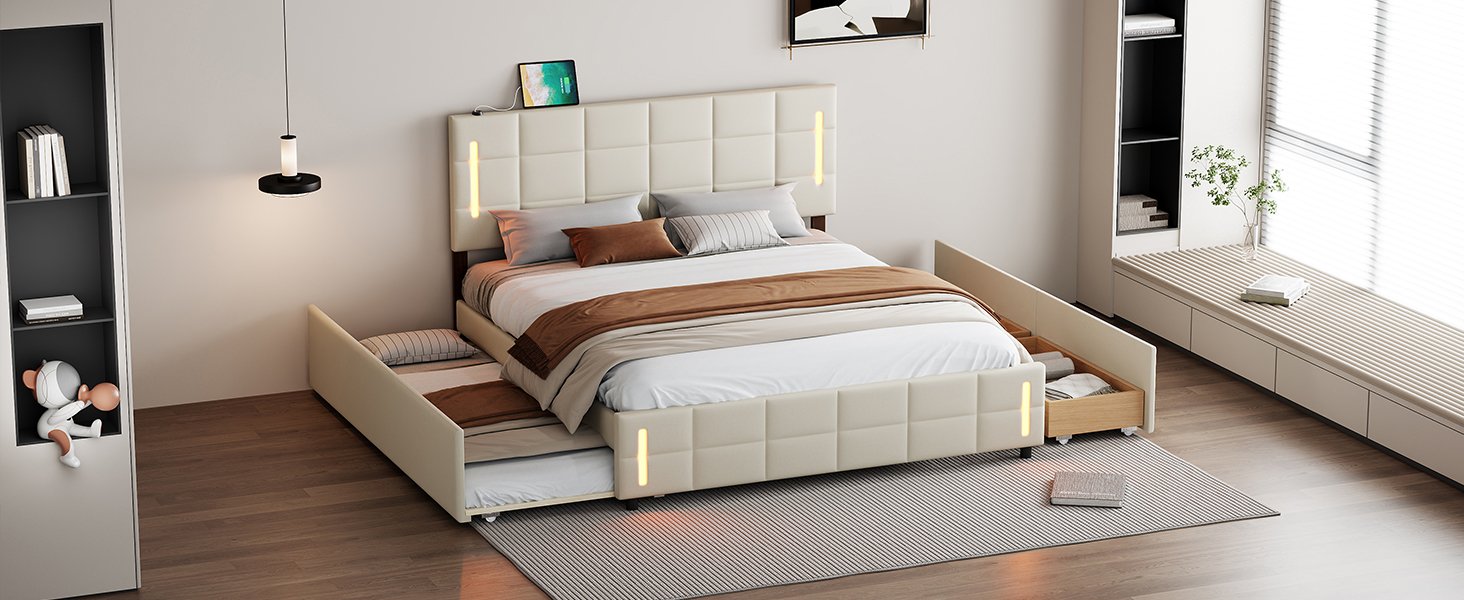 With its LED headboard design, this bed brings a classic atmosphere to your home. The design ensures comfort and relaxation, providing a fun and cozy space for you. This upholstered platform bed is built to last a lifetime while maintaining its stylish look, with clean lines that blend seamlessly with any surroundings. The bed includes a trundle, making it perfect for those who love sleepovers. Additionally, two spacious drawers help keep the room tidy. Use the remote control or mobile app to adjust the LED lights, which can create a romantic ambiance or serve as a nightlight. The headboard is also equipped with USB ports for charging an iPad or laptop.