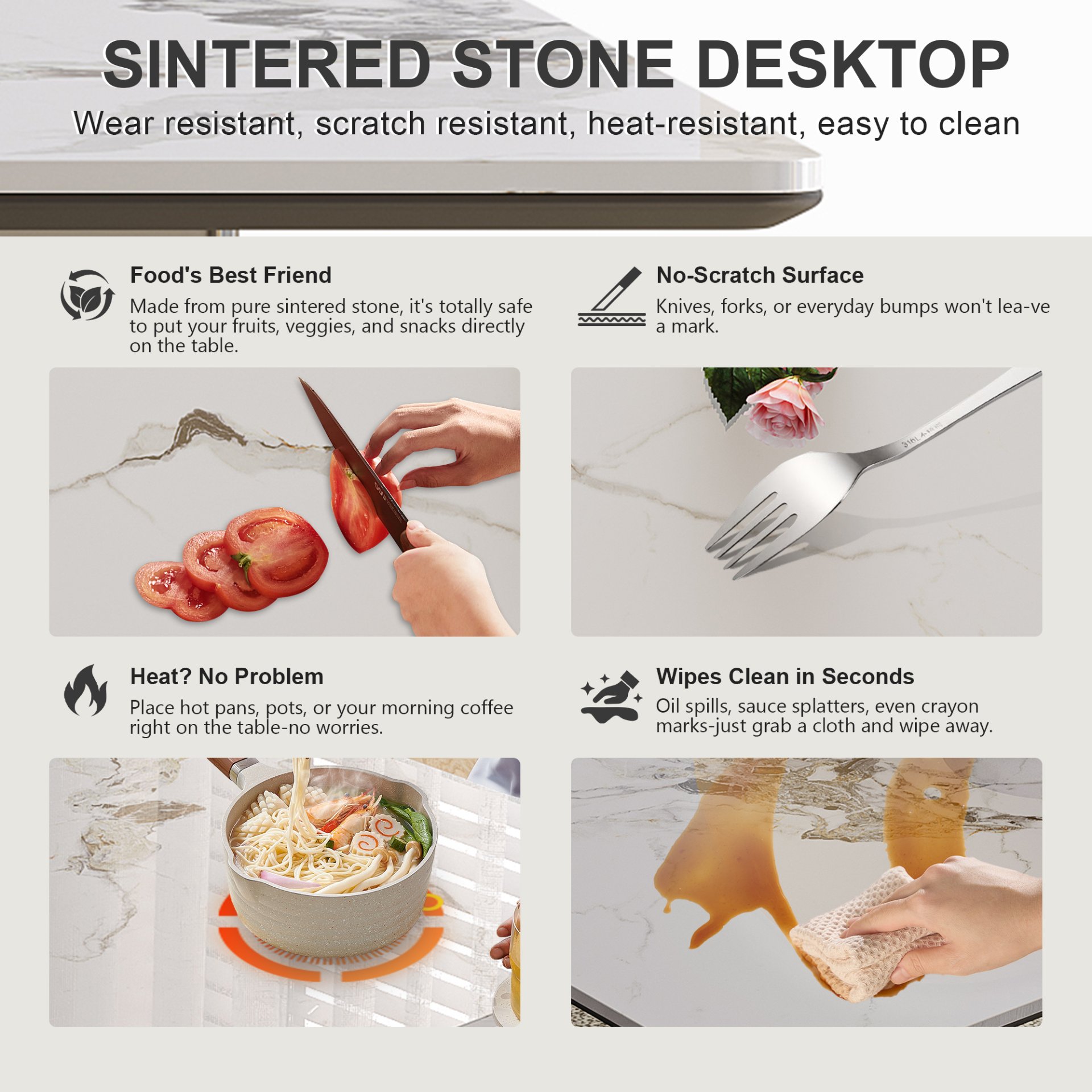 • Durable Sintered Stone Top: 12mm thick, scratch-resistant, fireproof, and oil-repellent surface