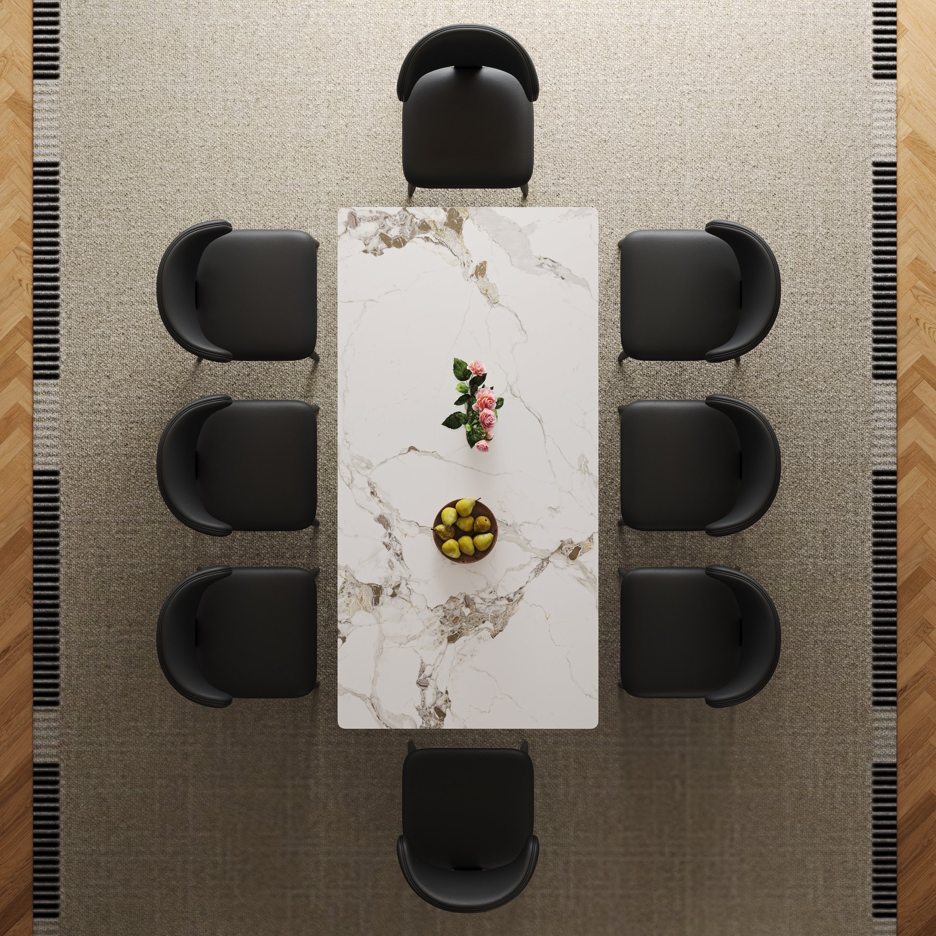 • Premium Leather Chairs: Comfortable seating with a sleek black finish for a refined look