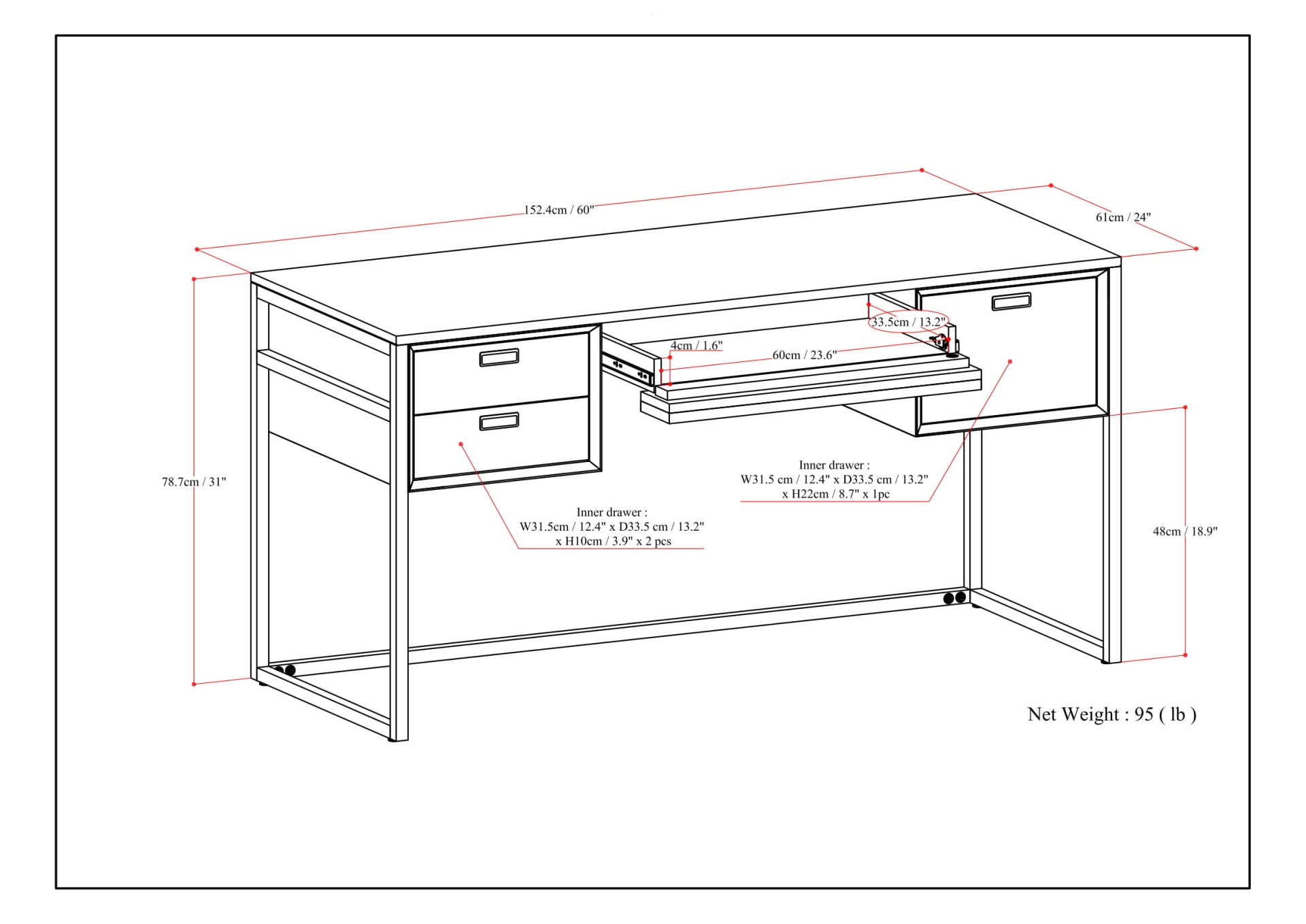 • Features a flip down pull-out keyboard tray, three drawers- (1)deep drawer with hand pulls and metal drawer glides