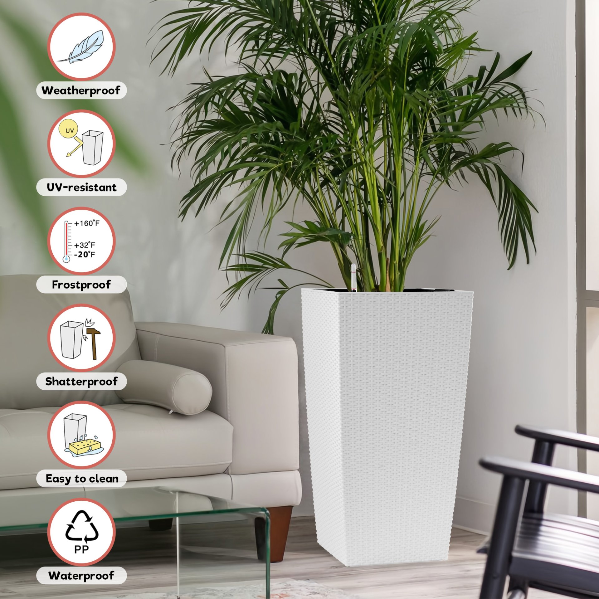 • Weather Resistant: UV-stabilized PP plastic withstands sun and rain