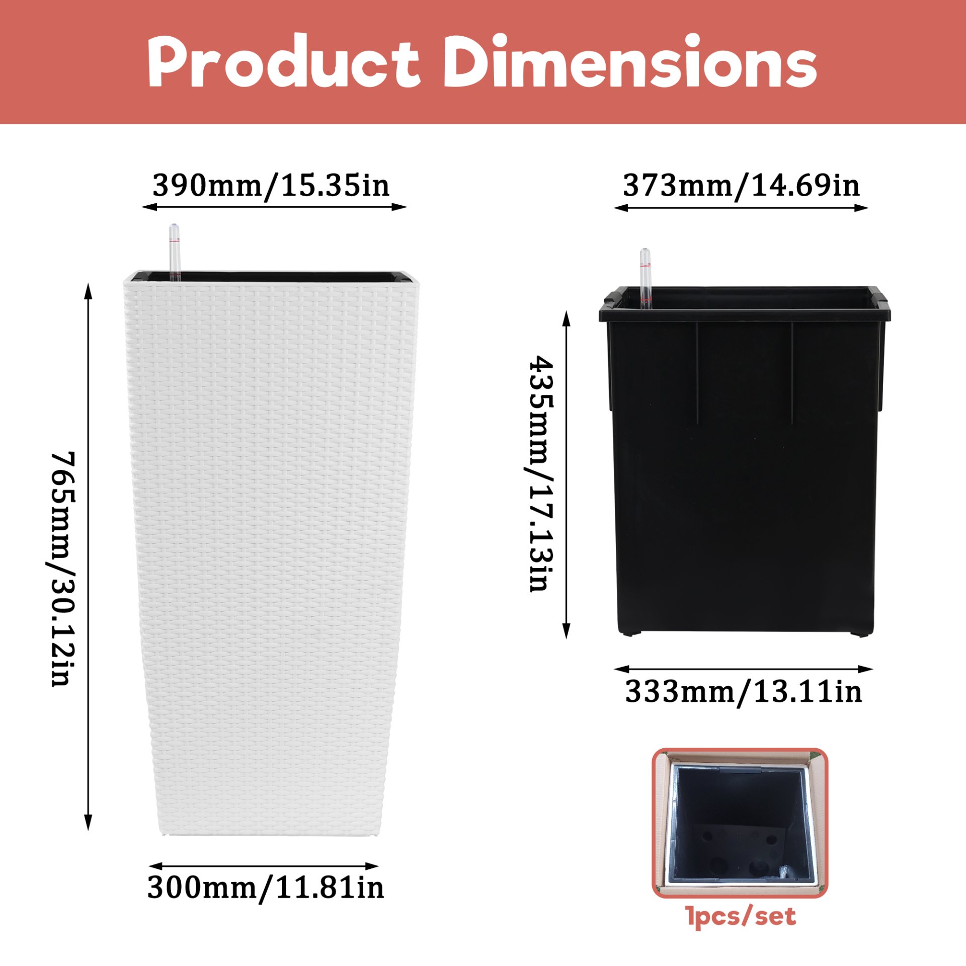 • Drainage System: Includes drainage holes and inner tray for excess water