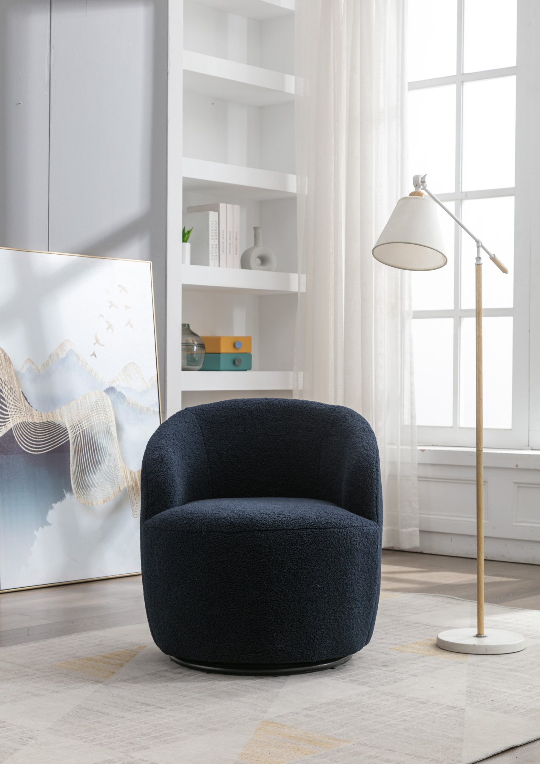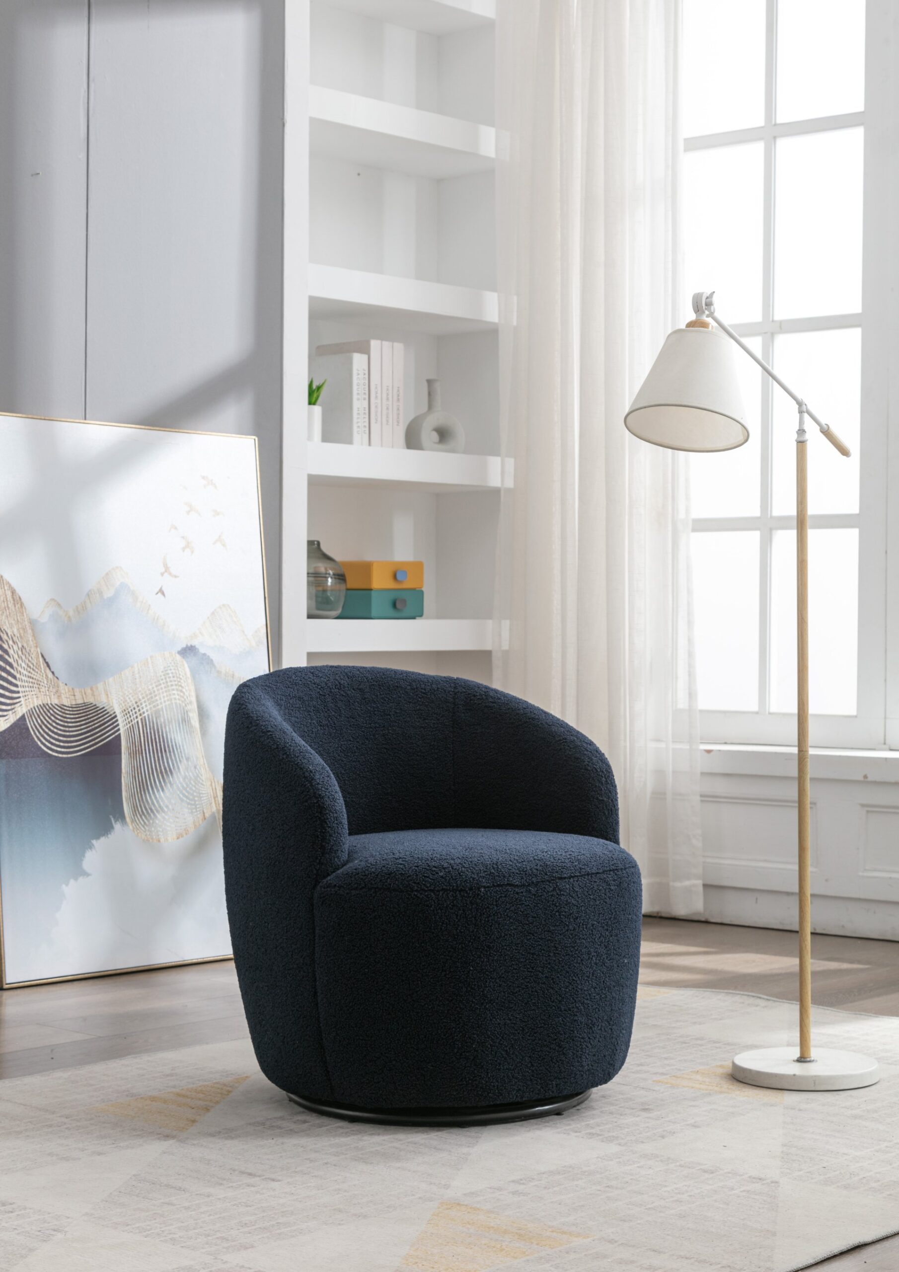 1.Product Composition:Soft Teddy Fabric Material+Foam Filled+Wooden Frame+Black Point Round Swivel Base+Upholstered