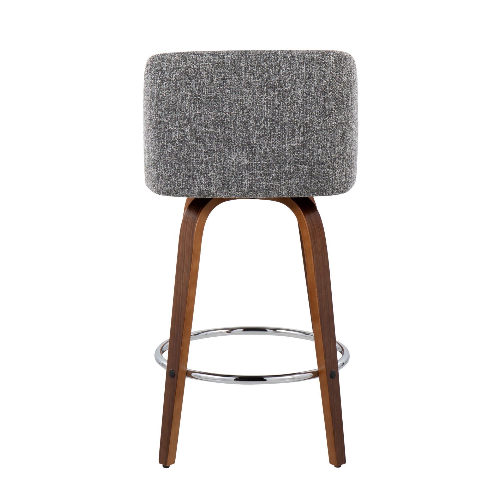 • Construction and Features: This stool features a padded upholstered swivel seat for added comfort. It sits on fixed-height bent wood legs and includes a round built-in footrest with a chrome finish, offering both style and functionality.