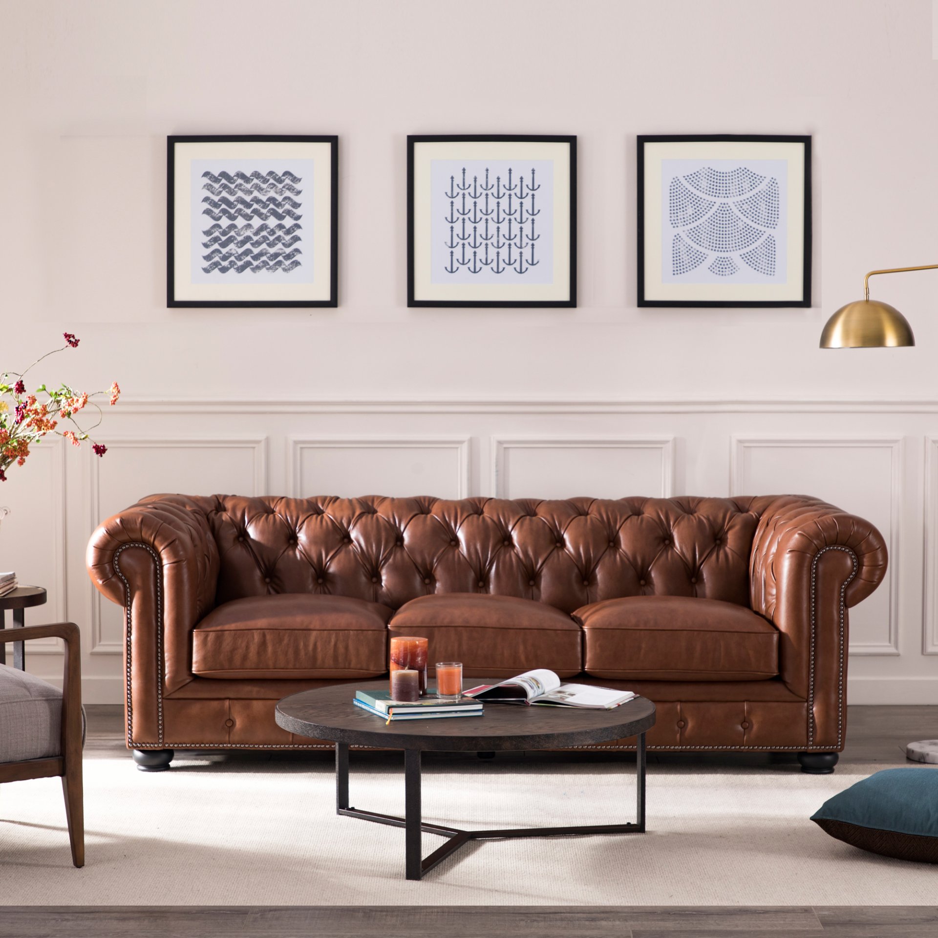 Bring traditional style to your seating ensemble with this chesterfield sofa. Enveloped in genuine top-grain cowhide leather, this sofa strikes a traditional silhouette with rolled arms and a deep seat, while turned bun feet sport a handsome dark stain. Deep button tufting and nailhead trim lend a tailored touch, while sinuous springs suspension and foam, polyester, down fill cushions provide comfort and support.