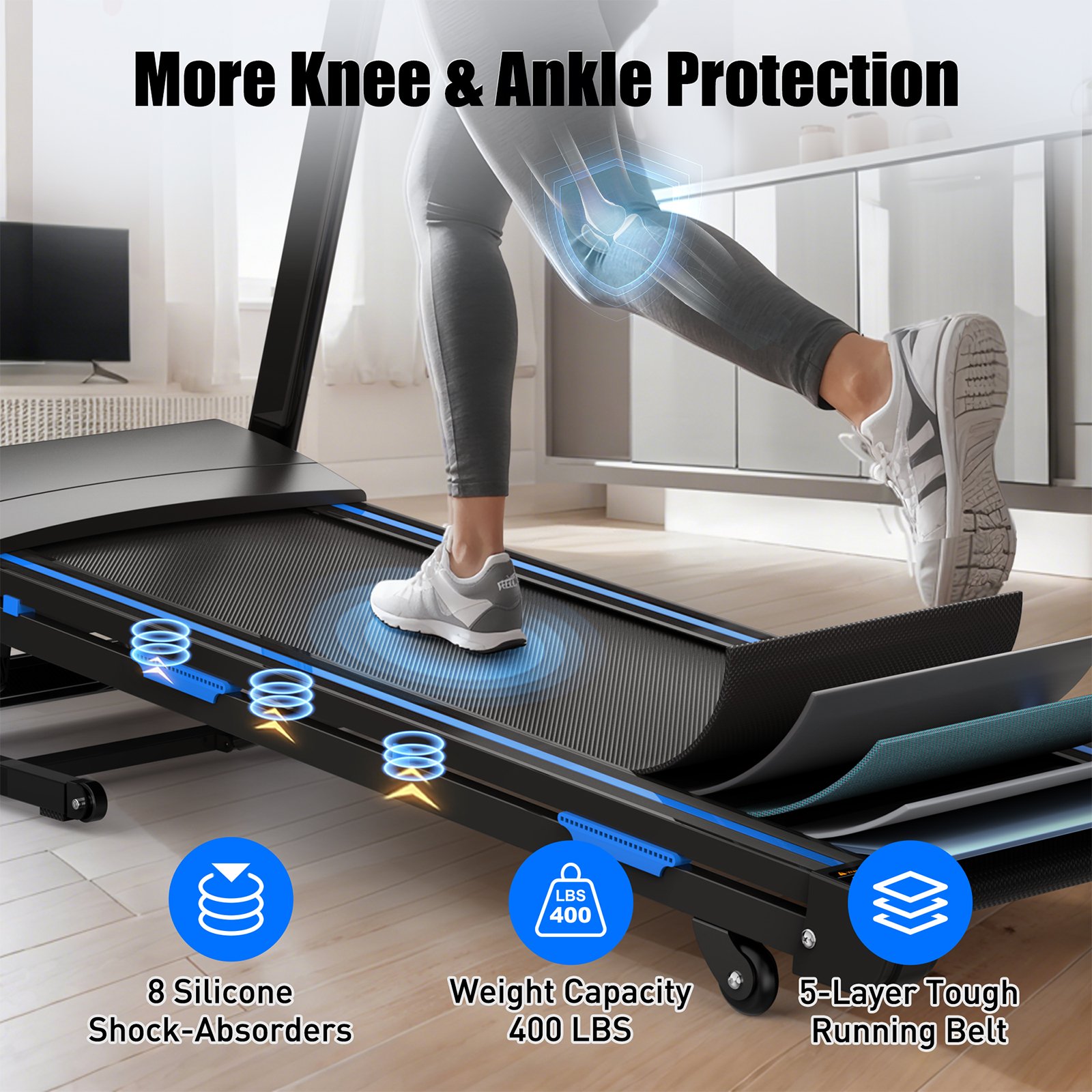 • Comfortable Running Belt: 7-layer shock-absorbing running belt simulates real-road running with a running area of 16.5" x 47.2".