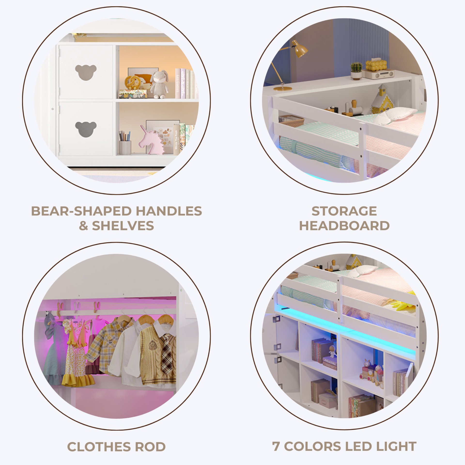 • Fun & Functional Detail: Includes color-changing LED lights with seven vibrant settings to personalize your child's space. Bear-shaped cabinet handles add a playful touch to the sleek design.