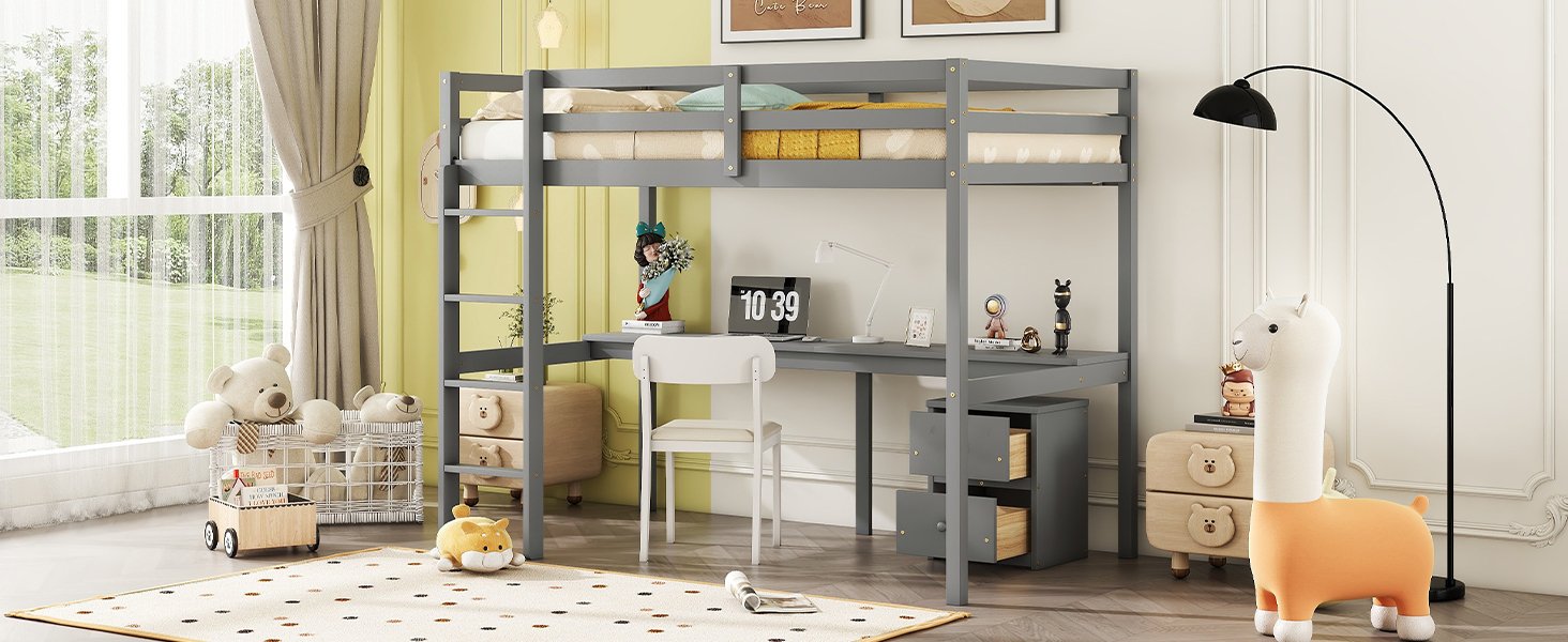 • Under-bed Desk and Storage: This loft bed features a spacious area beneath the upper bed, accommodating a full-length desk and a storage cabinet with 2 drawers, ideal for a neat and productive study environment.