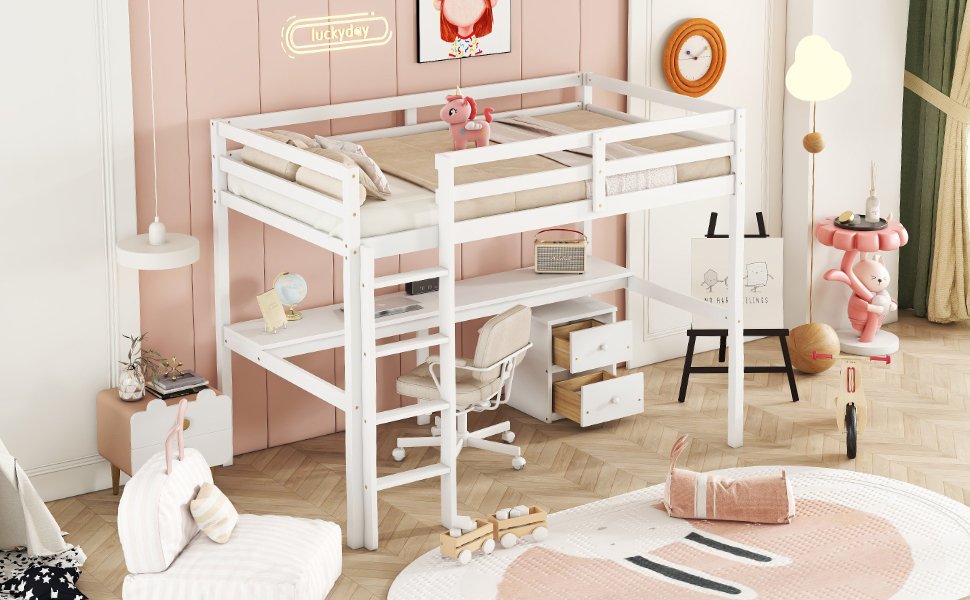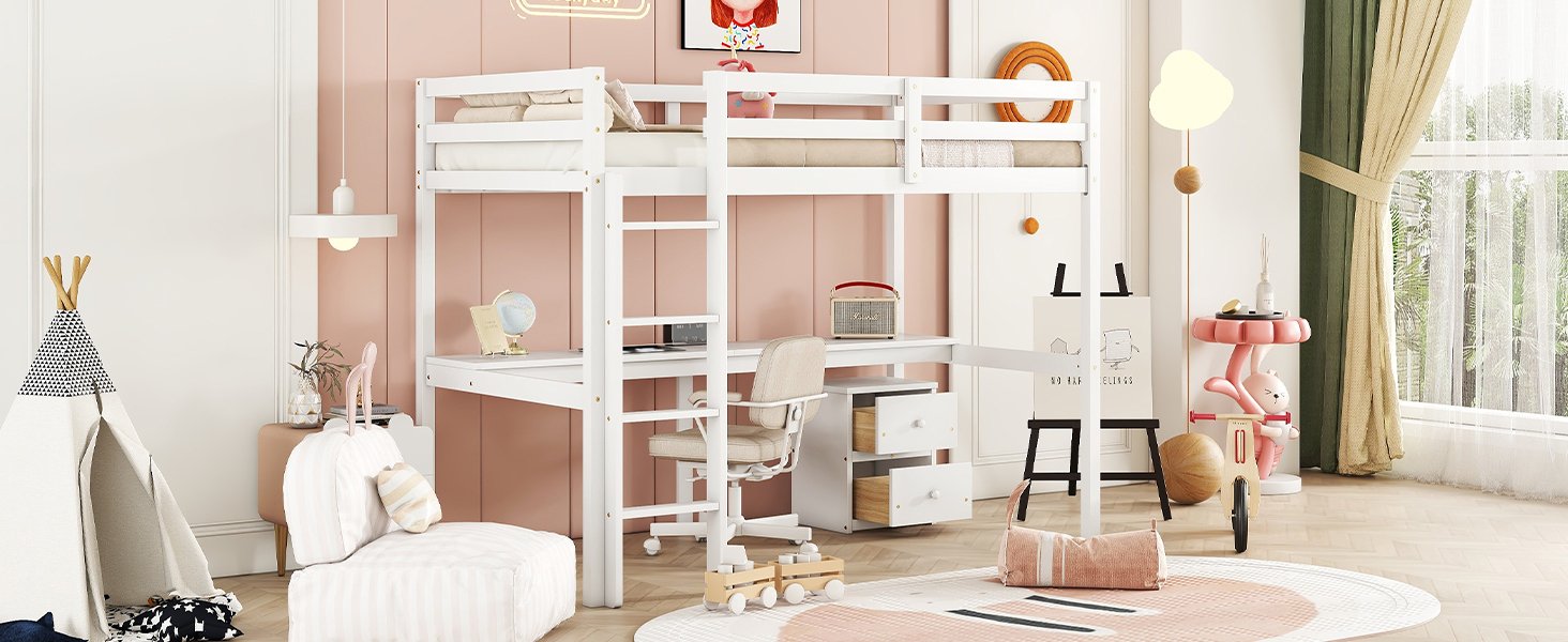 Under-bed Desk and Storage: This loft bed features a spacious area beneath the upper bed, accommodating a full-length desk and a storage cabinet with 2 drawers, ideal for a neat and productive study environment.