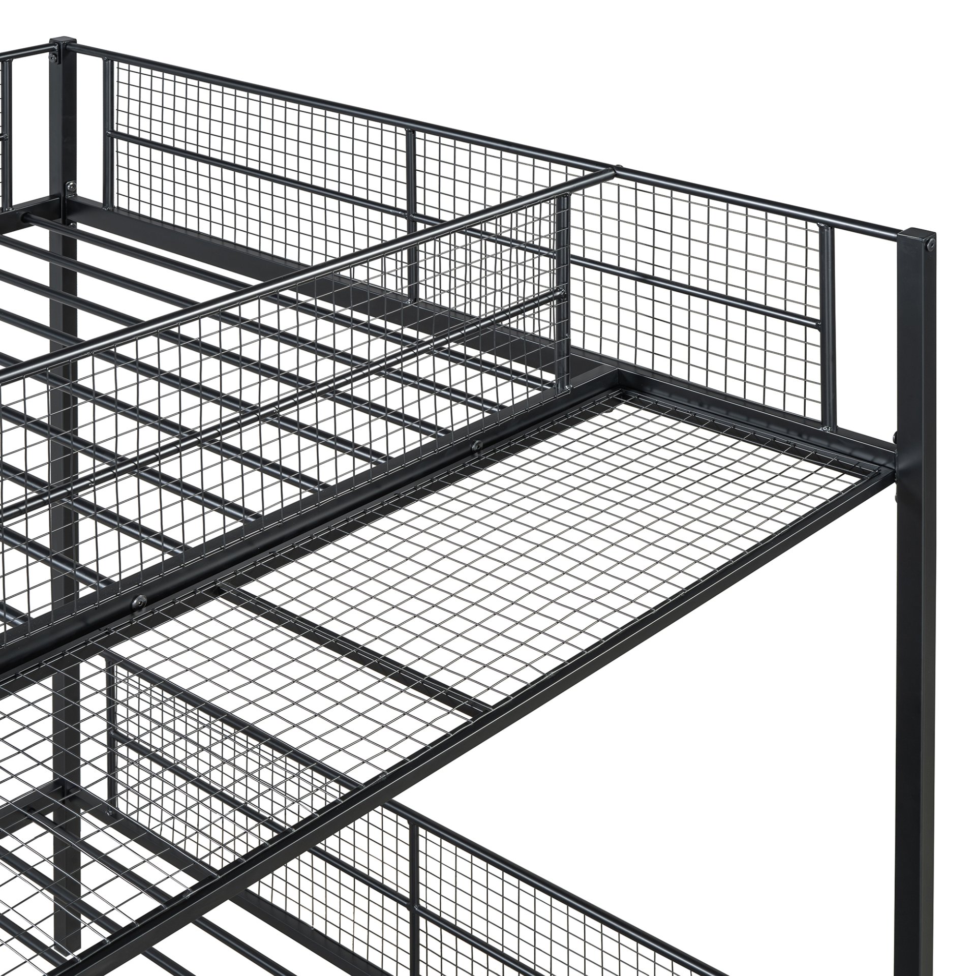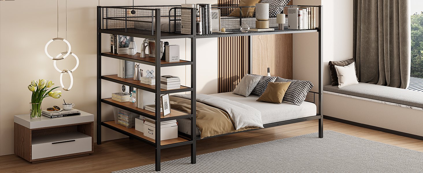 Accommodates multiple sleepers with ease, offering a twin bed on top and a full bed on the bottom—ideal for siblings, guests, or sleepovers. Keep your room clutter-free with the generous open space beneath the bottom bunk, perfect for storage boxes, luggage, or creating an extra functional area. Conveniently integrated into the staircase, these sturdy wooden shelves provide ample space for organizing books, toys, decorations, or daily essentials. A smart addition to the upper bed, this shelf is perfect for holding bedtime necessities like a lamp, water bottle, or favorite book. Crafted from a robust metal frame with a sleek finish and warm wooden accents, this bunk bed offers reliable support and timeless appeal.