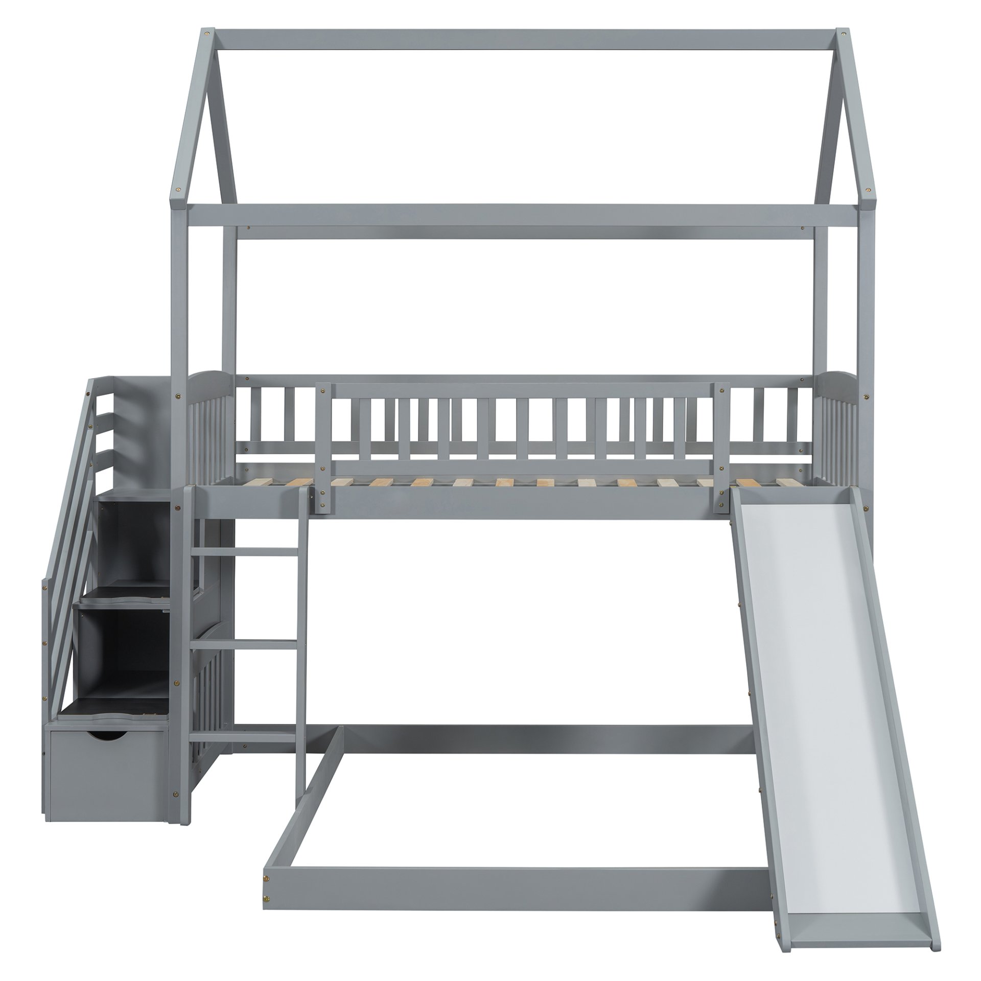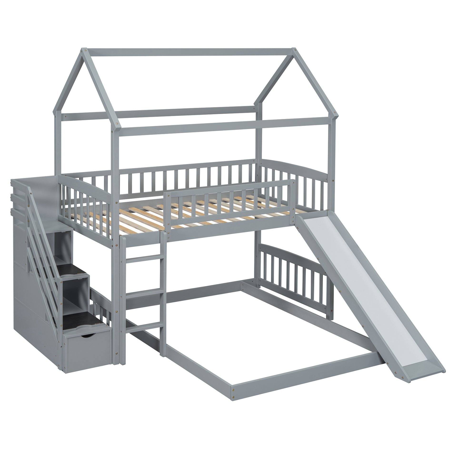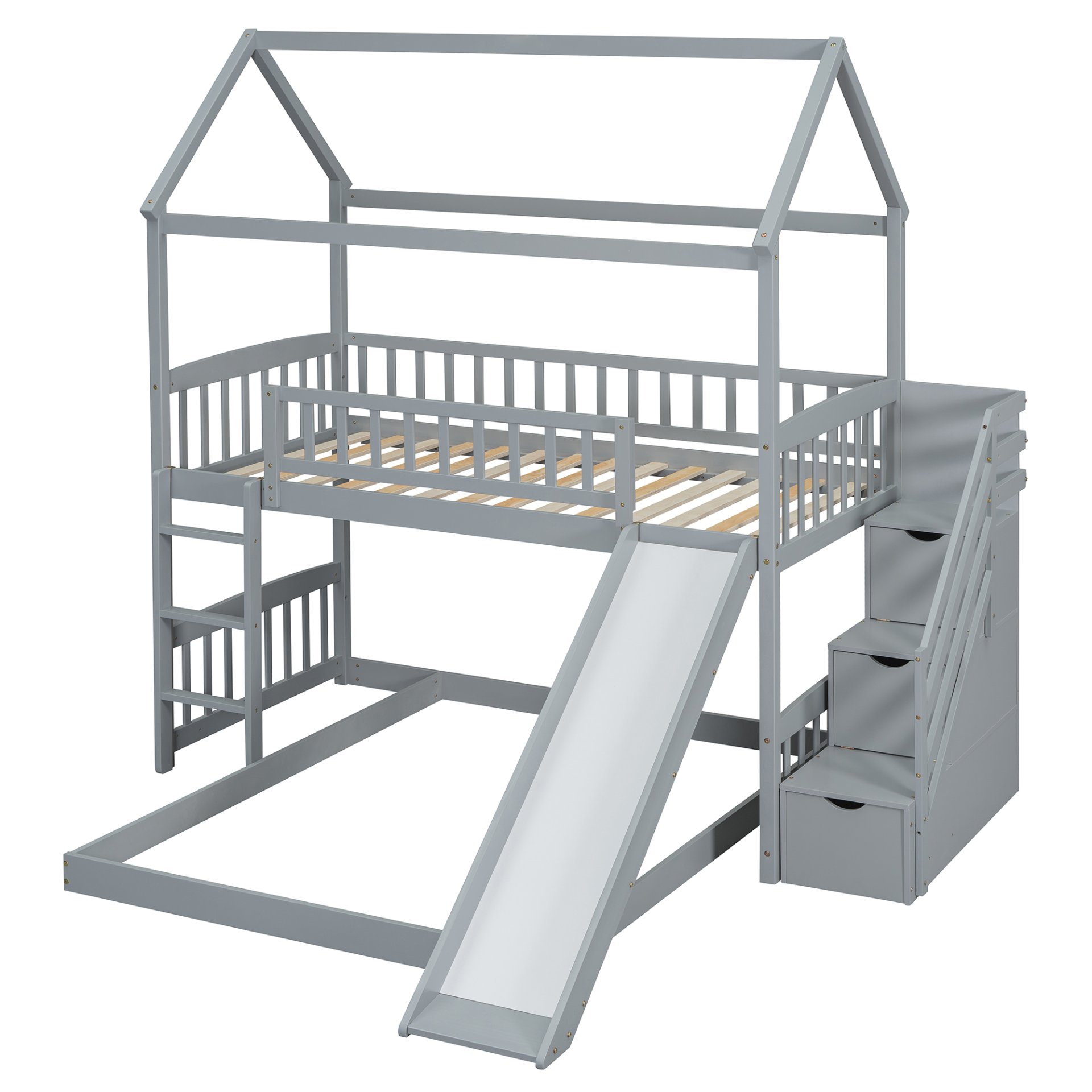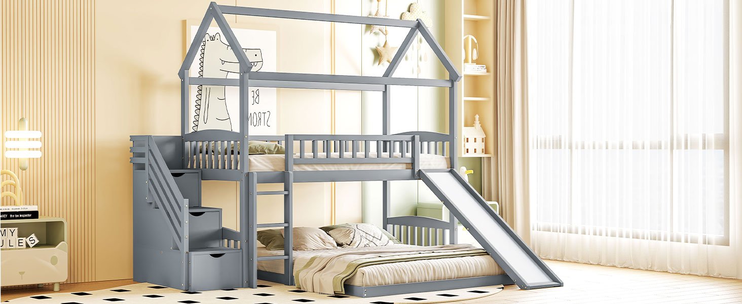 Friendly Design: Crafted with a whimsical playhouse design, complete with a slide and storage steps, this bunk bed offers a comfortable and exhilarating experience for both sleep and playtime, letting your imagination run wild. Perfect for hours of entertainment and relaxation, the playhouse design makes this bunk bed the perfect centerpiece for your bedroom.