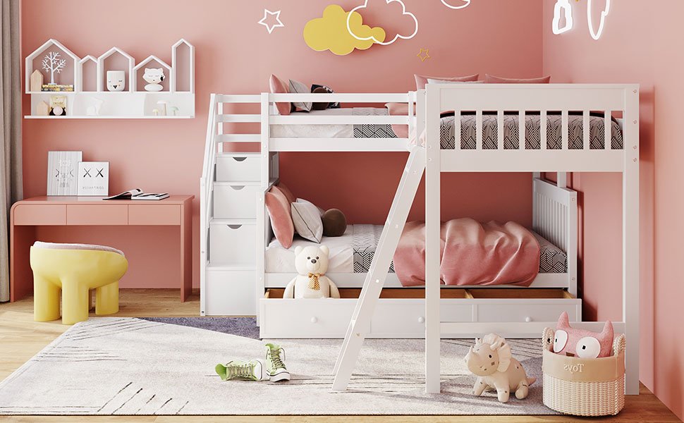 Maximized Space: The bunk bed takes up minimal space, making it perfect for spontaneous sleepover guests. Even better, the drawers and shelves in the staircase offer extra space for clothes and bedtime stories. Functional and aesthetic, this bunk bed will enhance any bedroom.