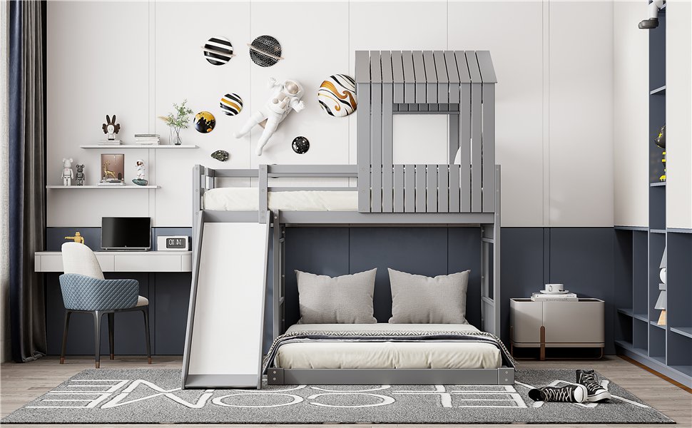 Playhouse-inspired Style: Crafted with a whimsical playhouse design while maintaining a tasteful natural appeal using a neutral color scheme, this bunk bed offers your family a comfortable and exhilarating experience during both sleep and playtime, allowing imaginations to run wild. Perfect for hours of entertainment and relaxation, the playhouse design makes this bunk bed the perfect centerpiece for any family bedroom.