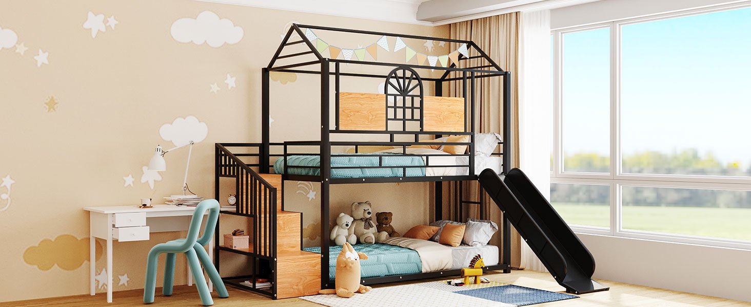 Unique Design: This bunk bed features a metal frame with wood boards beside the window, setting it apart from standard products. Not only is it visually distinct, but its functional features, such as the slide and storage stairs, make this bunk bed truly unique.