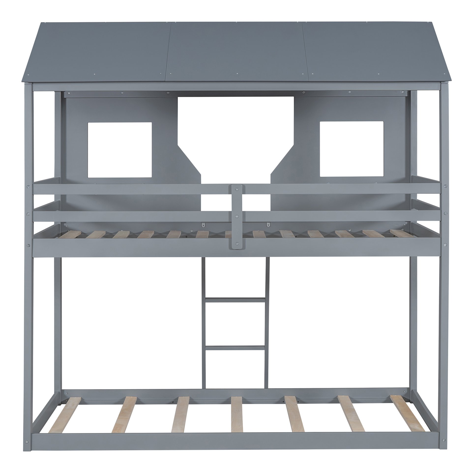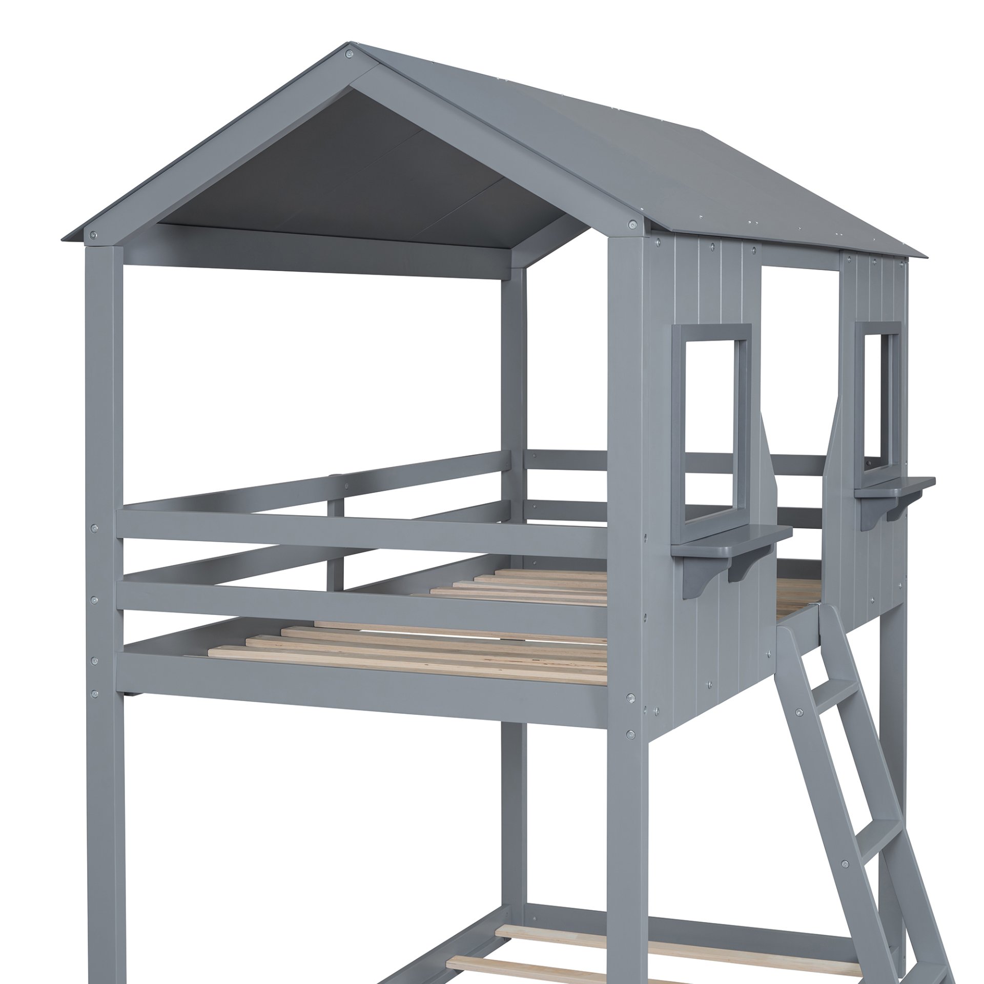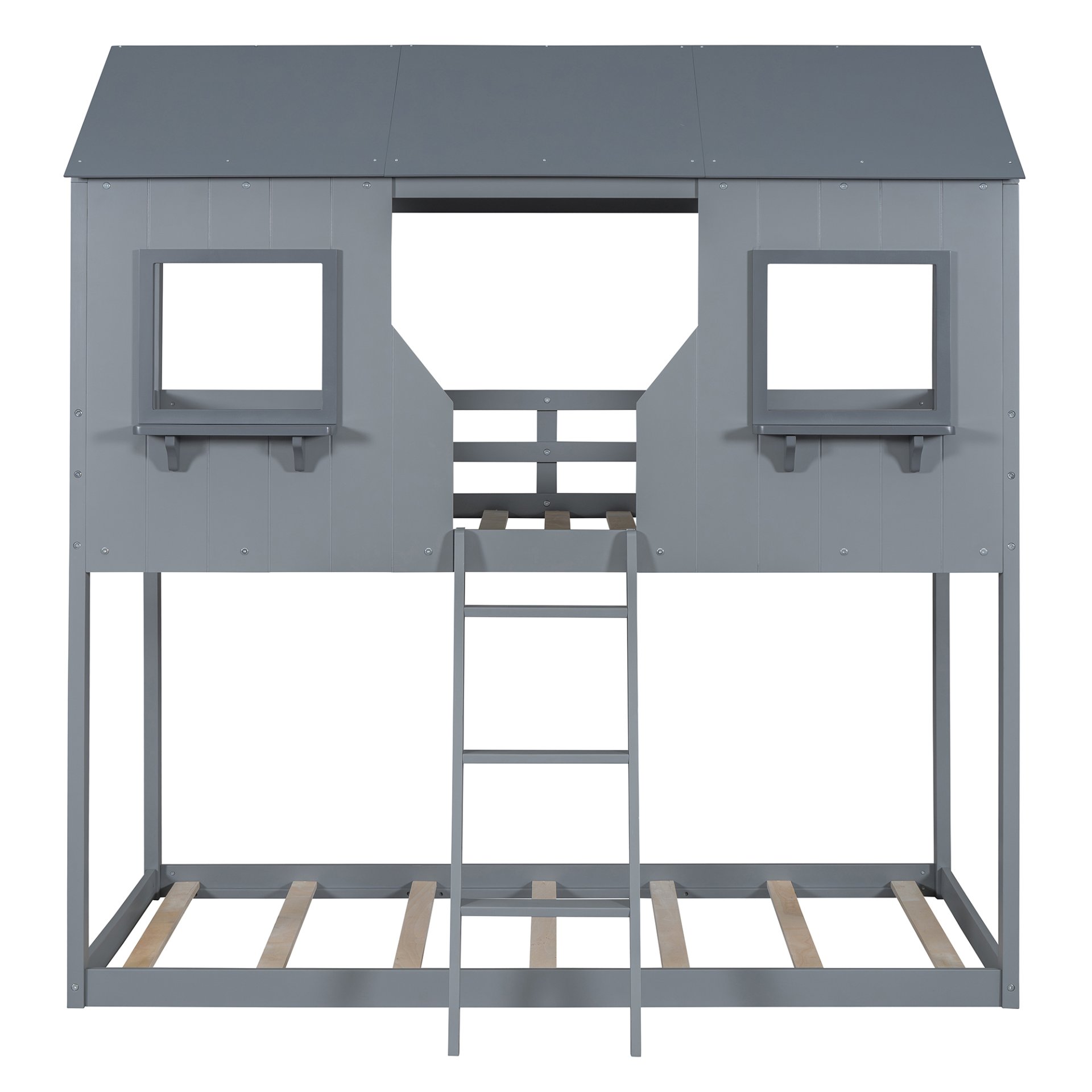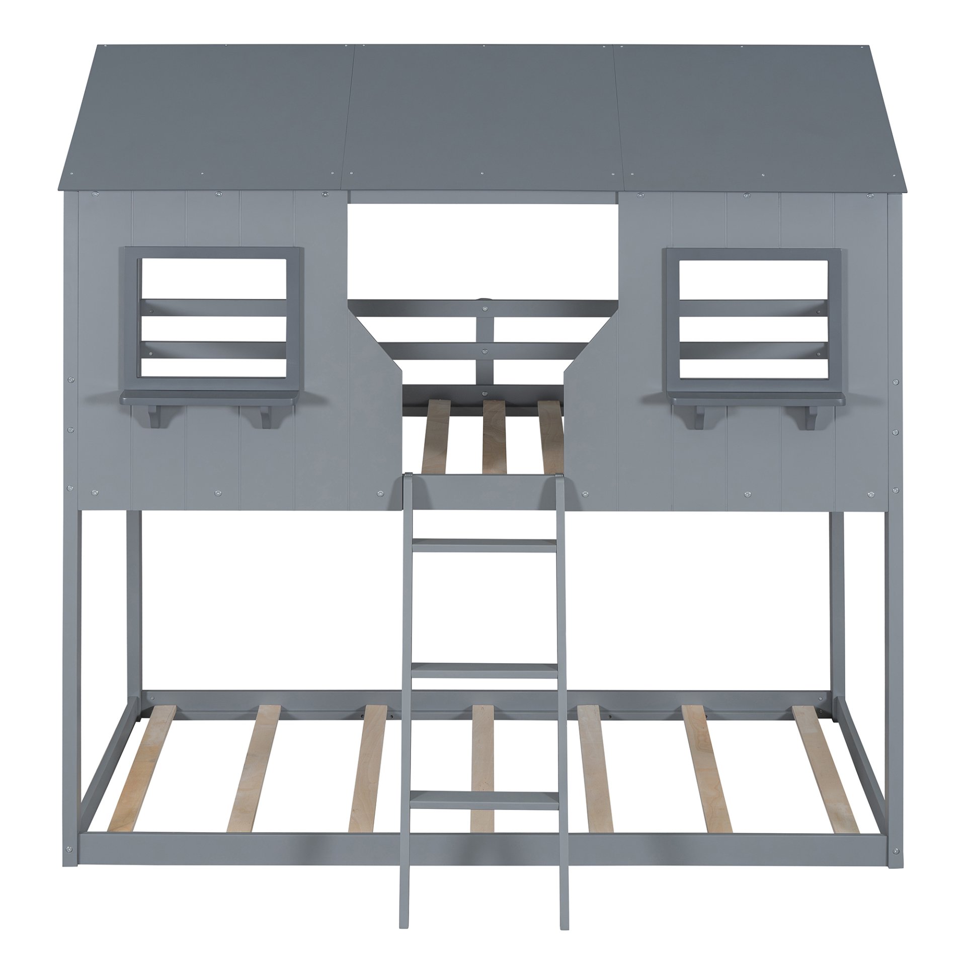 Playhouse Design Pitched roof, two front windows-this bunk bed combines unique design with comfort, creating an adorable and playful space for sleep and fun.