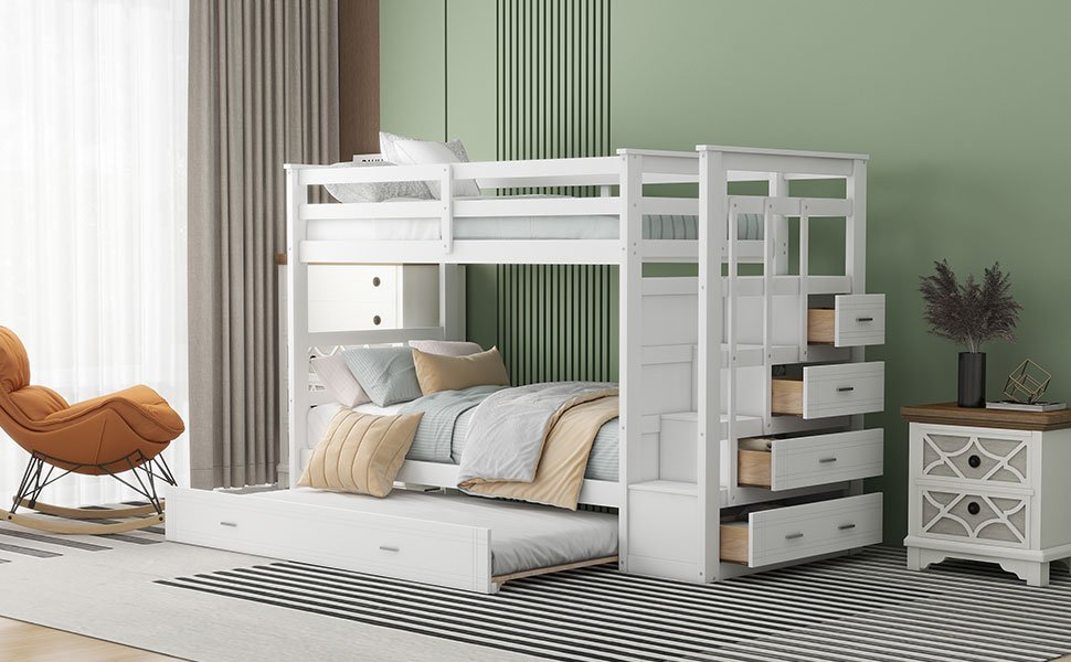 Maximize sleep space with a versatile bunk bed, perfect for cottages, extended family, out-of-town guests or lively sleepovers. The multifunctional staircase offers easy access to the upper bed, complemented by four storage drawers meeting families' organizational needs. Crafted from high-quality solid pine wood, the bed ensures sturdiness and durability with solid pine legs and a strong frame. Additionally, the trundle bed operates effortlessly with a simple pull or push, enhancing convenience and functionality in your bedroom.