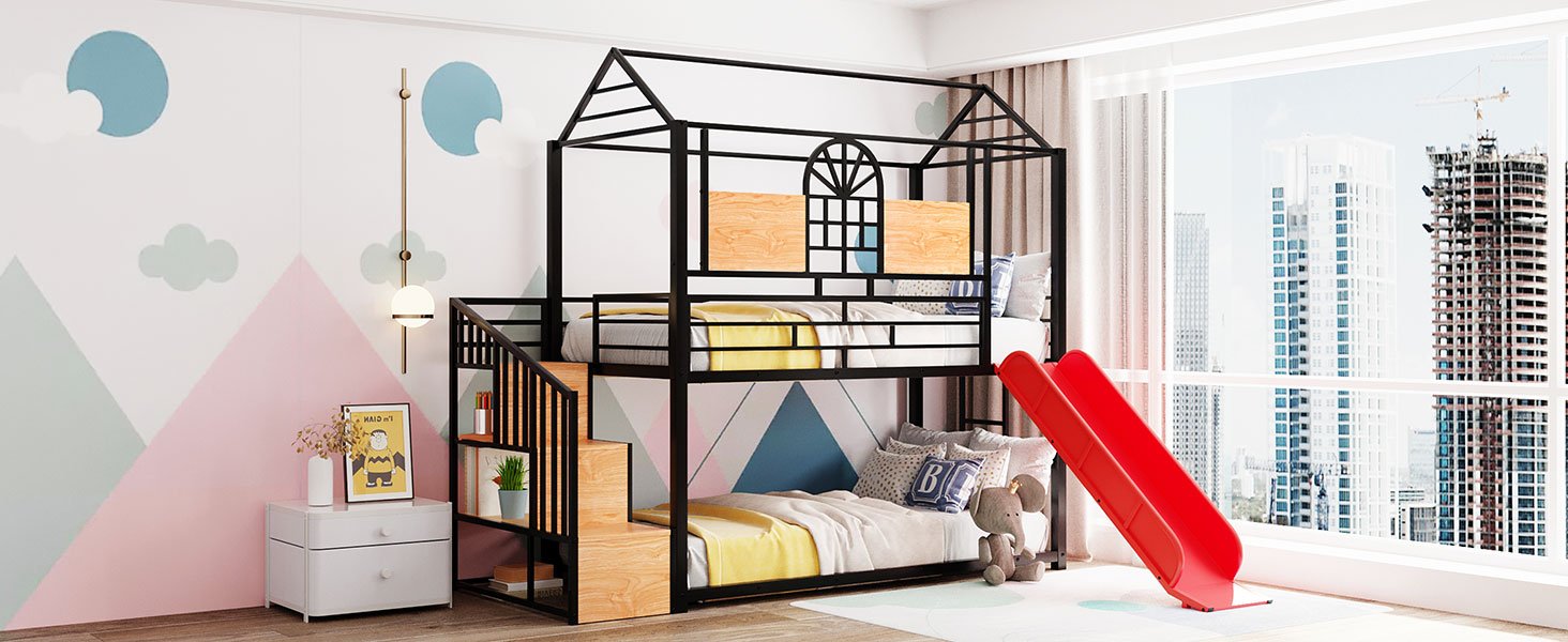Unique Design: This bunk bed features a metal frame with wood boards beside the window, setting it apart from standard products. Not only is it visually distinct, but its functional features, such as the slide and storage stairs, make this bunk bed truly unique.