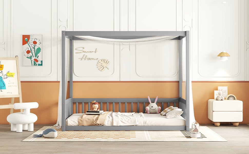 • Safety and Quality: Made from premium pine wood, the bed's sturdy canopy frame ensures durability and safety for users.