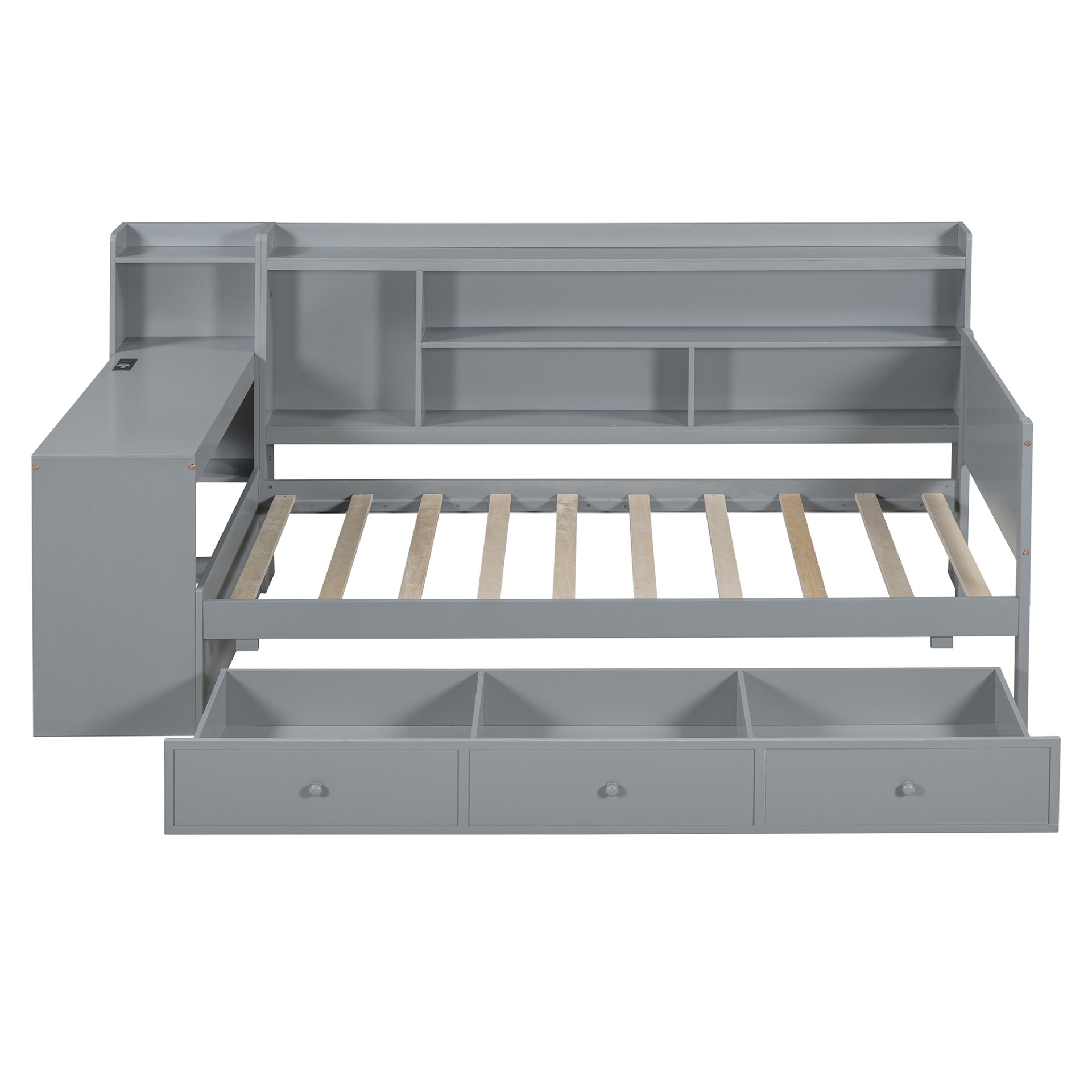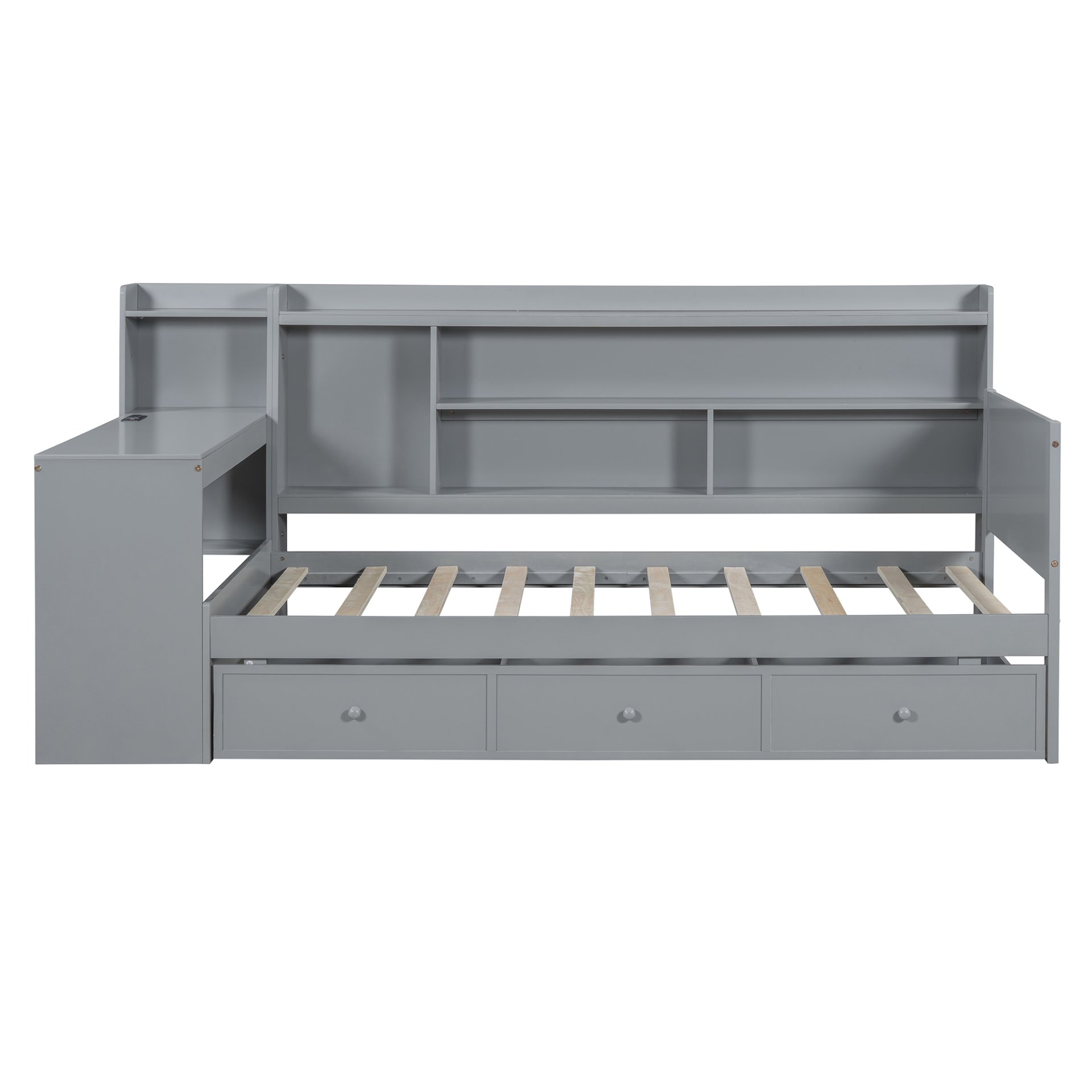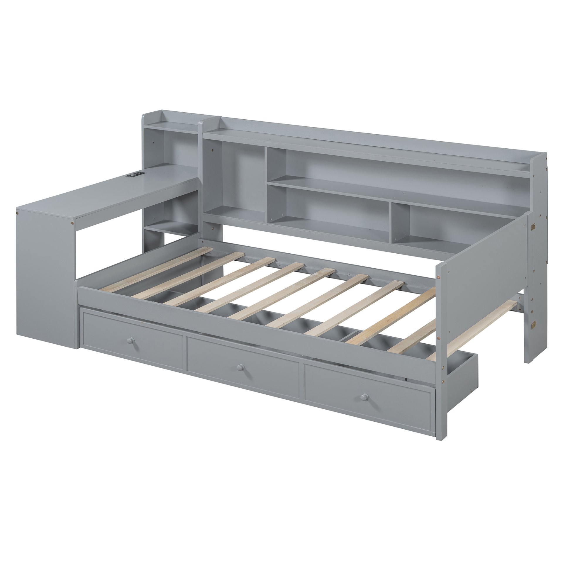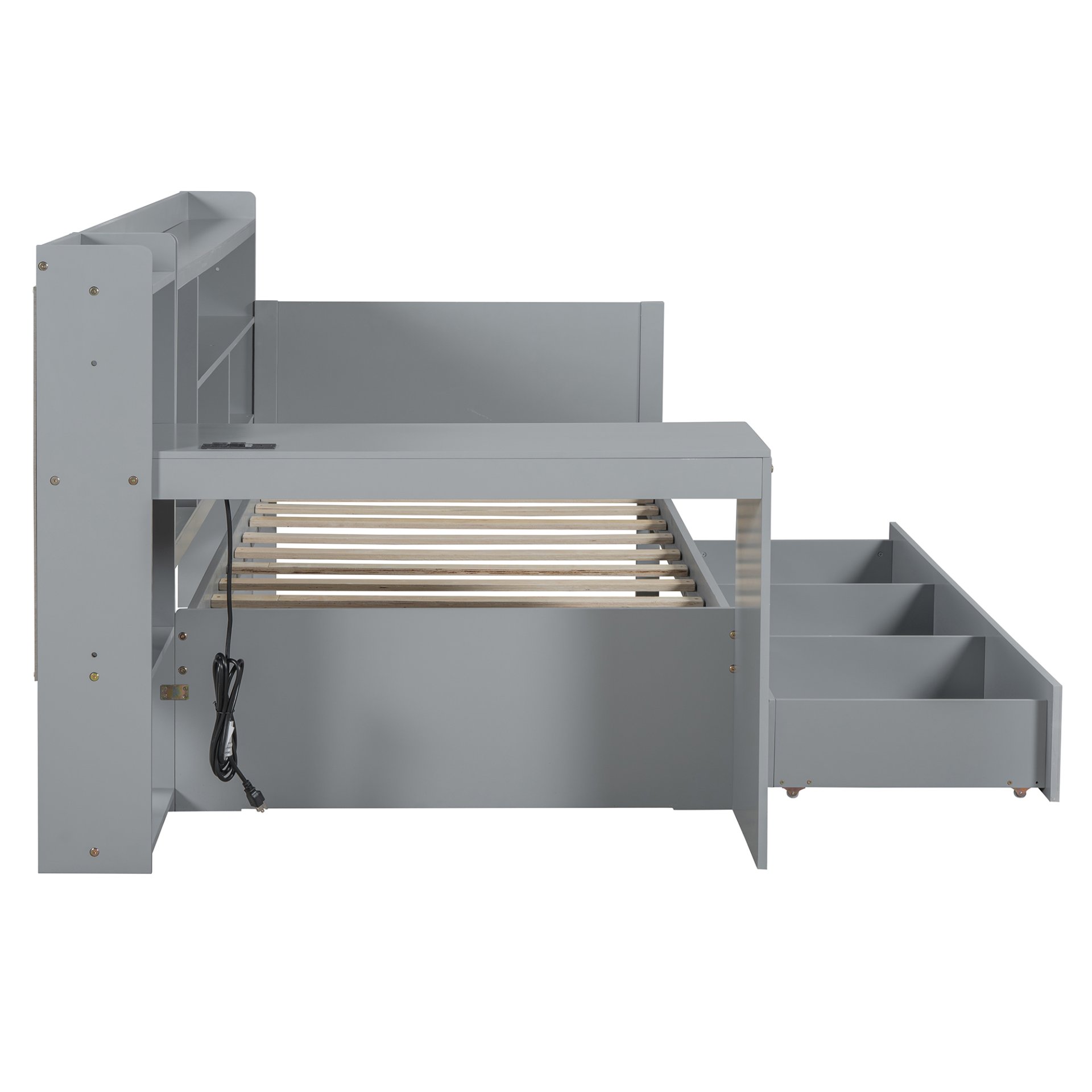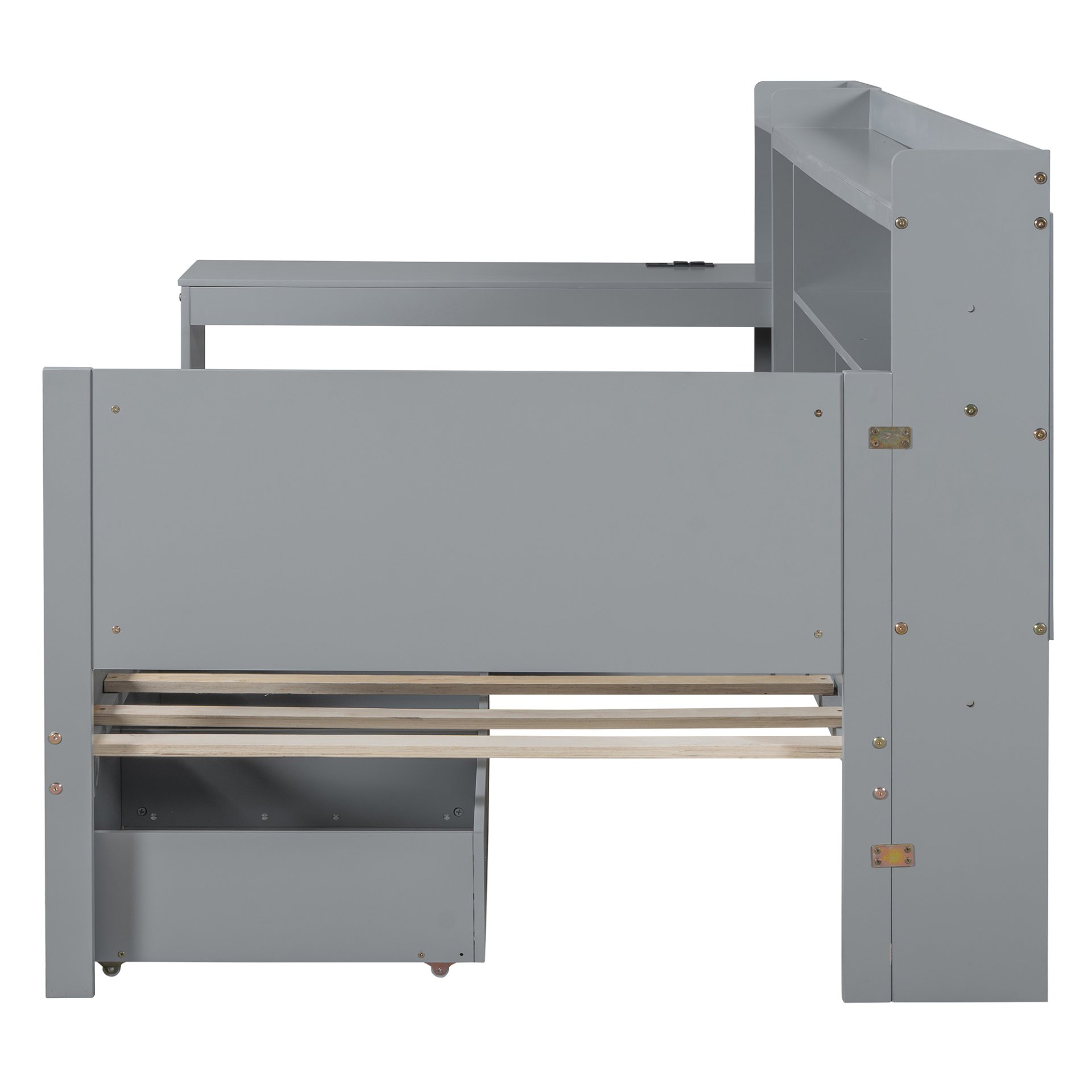 Transform your bedroom with this versatile pine wood bed frame, designed for comfort and style. Made from high-quality pine, it offers exceptional durability with 10 supportive slats, eliminating the need for a box spring.Maximize your space with three spacious drawers for storing clothes and linens, keeping your room organized. The side compartments are perfect for books or small items, and the top surface is ideal for decorative pieces.A standout feature is the integrated desk, equipped with USB ports and power outlets, making it easy to charge your devices while you work or study. This multifunctional design combines a bed and a desk, perfect for smaller spaces.With overall dimensions of 92.1''L x 48.1"W x 42.5"H, it fits various bedroom layouts.