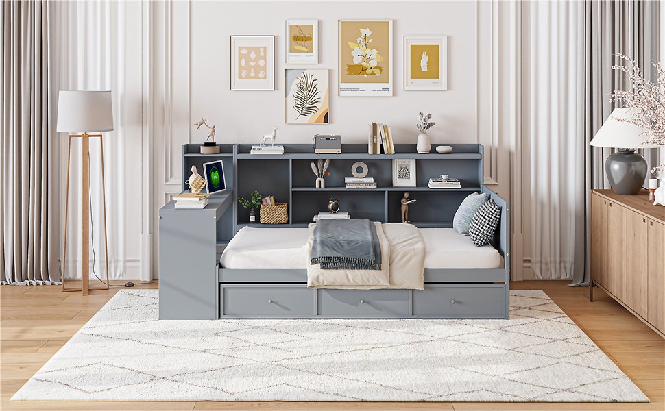 Integrated Desk with Charging Ports: The side desk includes USB ports and power outlets, allowing you to charge your devices effortlessly. This multifunctional design combines a desk and a bed, optimizing space in your room for work or study.