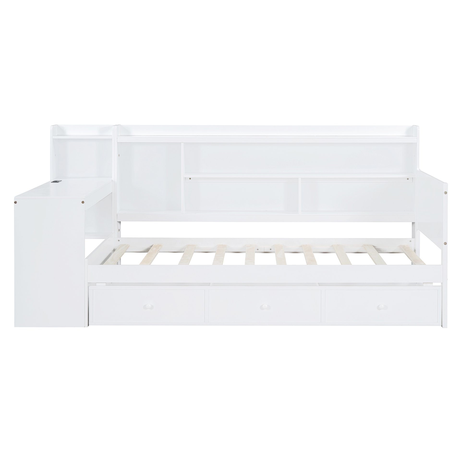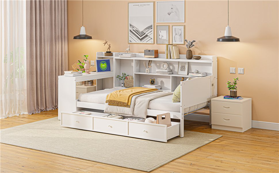 Transform your bedroom with this versatile pine wood bed frame, designed for comfort and style. Made from high-quality pine, it offers exceptional durability with 10 supportive slats, eliminating the need for a box spring.Maximize your space with three spacious drawers for storing clothes and linens, keeping your room organized. The side compartments are perfect for books or small items, and the top surface is ideal for decorative pieces.A standout feature is the integrated desk, equipped with USB ports and power outlets, making it easy to charge your devices while you work or study. This multifunctional design combines a bed and a desk, perfect for smaller spaces.With overall dimensions of 92.1''L x 48.1"W x 42.5"H, it fits various bedroom layouts.